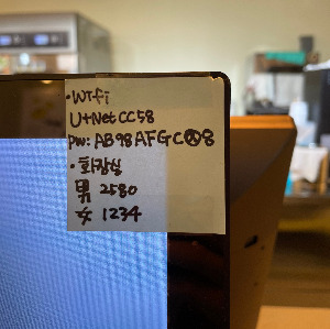 커피 주문을 하고 자리에 앉았다가 다시 카운터에 가서 와이파이 비밀번호를 물어본다. 다행히 와이파이 비번을 눈에 잘 띄는 곳에 붙여둔 것 까지는 좋았는데 인터넷 설치 시 설정된 비밀번호가 그대로 적혀 있다. 대문자와 소문자가 무작위로 섞여 있는 10자리 코드. 집중해서 한 글자 한 글자 핸드폰에 입력해본다. 한 번에 통과되지 못하고 지웠다 썼다를 두세 번 반복한다.