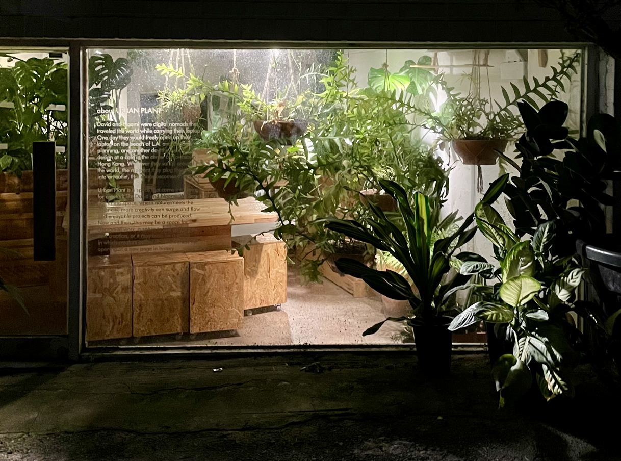 식물로만 가득한 카페 공간. 밤에도 시선을 끌기에 충분하다.