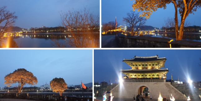 진주성의 밤은 낮과 다르다. 낮에는 산책을 하는 사람이 많았다면 밤은 고즈넉한 분위기와 멋진 경치가 펼쳐져 무척 아름다운 분위기를 자아낸다. 주황 빛 조명이 성벽 바깥에서 성벽과 나무를 비추고 강을 사이에 둔 맞은편 도심과 둘을 이어주는 다리의 풍경은 강에 비춰 아름다움을 뽐냈다.