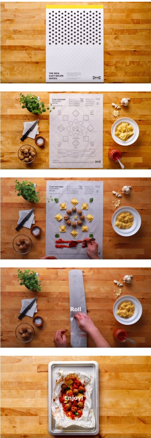 이케아가 요리를 싫어하는 사람들을 위해 내놓은 놀라운 컨셉의 초간단 요리책입니다.이케아 캐나다가 토론토의 마케팅회사 리오 버넷과 협업해 만든 것으로, 제목은 '이 페이지를 요리하시오(Cook This Page)'입니다.'빈 칸을 채우시오(fill-in-the-blanks)'라는 부제로 캐나다에서 이벤트를 통해 일부 소비자들에게 공개된 이 요리책의 사용법은 이렇습니다.우선 주재료는 모두 이케아에서 파는 식품들을 기준으로 하며, 기초 손질 없이 곧바로 조리에 투입할 수 있는 냉장, 냉동 재료들을 활용합니다.간단하게 분리할 수 있는 포스터 모음집 타입의 책에서 원하는 요리가 있는 페이지를 분리한 후, 실물 크기의 선 위에 지시된 만큼의 식재료를 올려놓습니다.그런 다음, 순서대로 하나씩 뿌리고 얹거나, 혹은 종이 통째로 ‘잘 싸서’ 오븐에 넣습니다. 책은 버터와 같은 식품을 포장할 때도 쓰이는 오븐용 종이에, 식용 잉크로 인쇄했습니다.요리를 못하는 사람도 흥미롭게 즐길 수 있을것 같습니다. 예쁜 색칠놀이 하는 기분도 들거같구요.4월 처음 소개돼 D&AD 디자인상 등을 수상했으며, 아직 정식으로 출간되지는 않았습니다.총 3가지 요리에 대한 자세한 활용법은 위 영상을 통해 볼 수 있습니다.