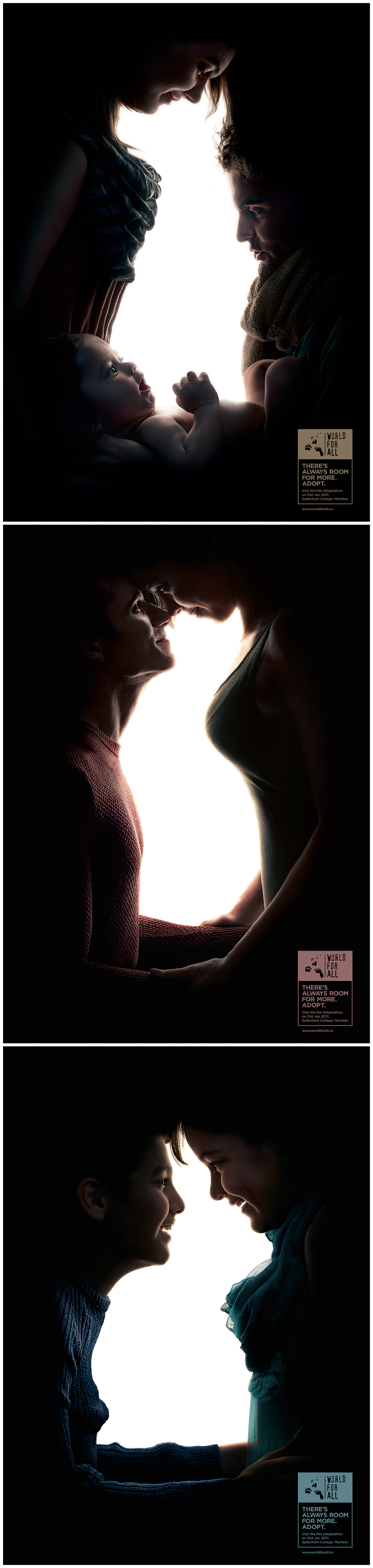 감성을 자극하는 반려동물 입양 광고 캠페인의 따뜻한 메세지SNS를 통해서 화제가 된 반려동물의 입양을 권장하는 광고 캠페인을 소개해 볼까 합니다. 이 캠페인은 인도의 동물보호협회 'World For All'에서 제작한 반려동물 입양 광고 캠페인인데요. 광고 포스터에는 아이를 바라보고 있는 부부, 사랑하는 연인, 서로를 바라보고 있는 아이들의 모습이 담겨 있는데요. 자세히 사진을 바라다 보면 가족/연인/아이들 사이에서 강아지, 고양이, 토끼의 모습을 착시 현상을 통해 보여주고 있습니다. 감성적인 사진작가 Amol Jadhav와 아트디렉터 Pranav Bhidede의 작품으로 독창적인 조명과 프레이밍을 사용하여 각각에 두개의 이미지가 포함된 일련의 착시 인물 사진을 만들었습니다. 반려동물을 또하나의 가족으로 받아 들이겠다는 메세지를 전달하는 따뜻하고 감성적인 광고캠페인 인것 같습니다.