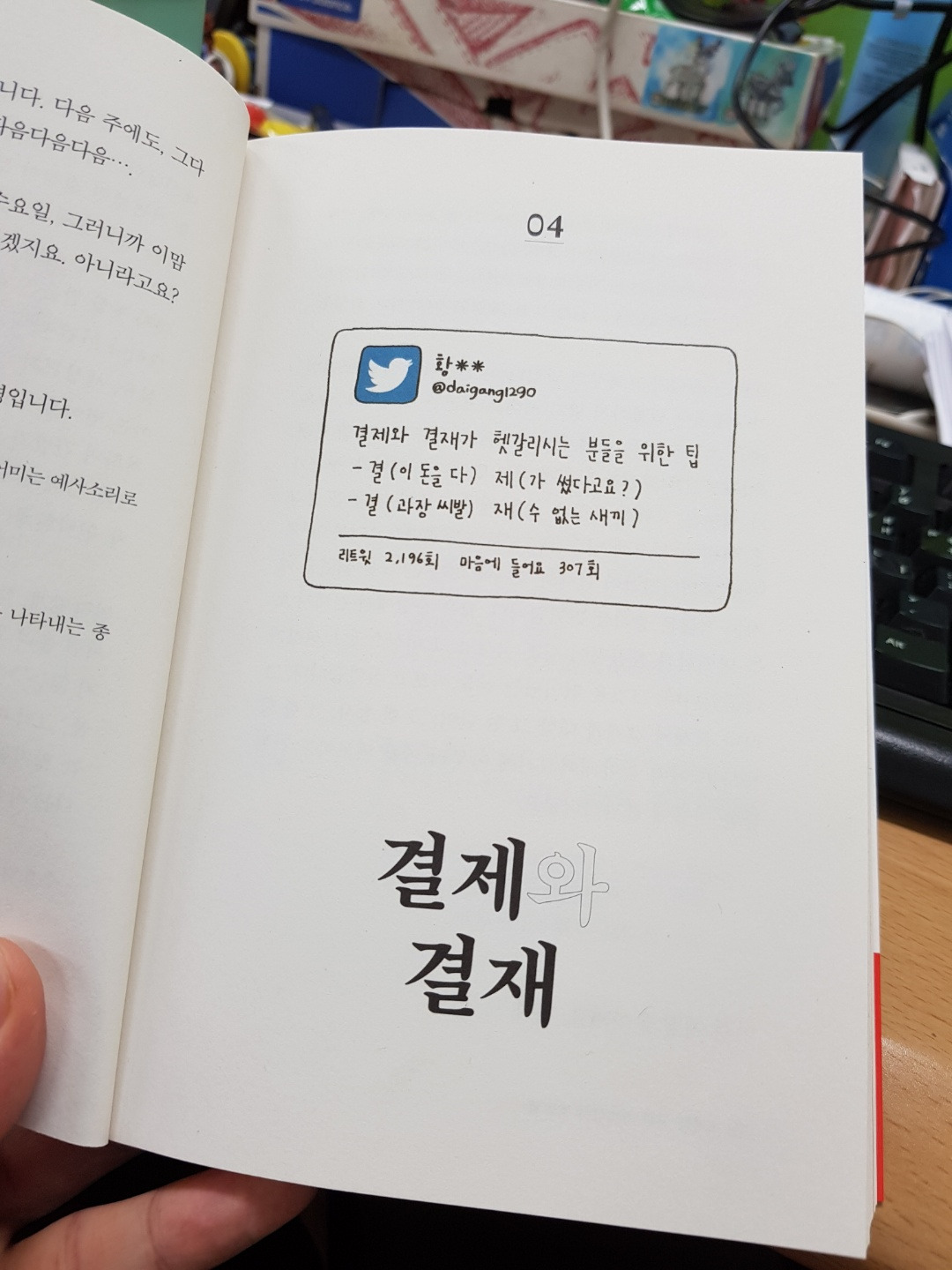 맞춤범을 소개하는 책입니다. 딱딱하거나 어렵지 않고 사진들에서 보이는 것처럼 일상생활에서 쉽게 틀릴만한 맞춤법들이 재미있는 예시들과 함께 설명되어 있어요.저 같은 경우에는 업무적으로 글을 쓰지 않더라도 평상시에도 (문자하거나 SNS 할 때) 긴가민가한 단어들이 많은데 글쓰는 직업이다 보니 맞춤법을 틀리면 안되다는 압박감 같은게 있어서 그때마다 검색해서 확인해 볼 때가 많은데요. 이 책에 선별된 단어들만 봐도 일상 생활에 많은 도움이 될 것 같다는 생각이 들었어요. 어렵게 느껴지는 한글 공부 책을 재미있게 편집하고 이런 형태로 펴낸것도 재미있는 아이디어라고 생각됩니다.