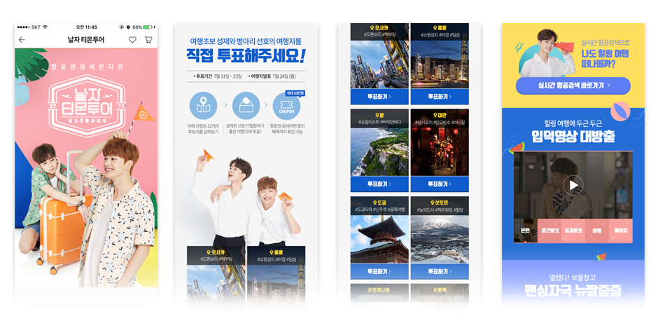 여행을 가기 위해 어디로 갈지 고민하는 순간은 굉장히 설레고 즐거운 순간입니다. 바로 얼마전까지 경쟁을 주제로하는 방송에서 뽑힐 사람을 선택하던 공간에서 일상에 지친 두 사람에게 꼭 추천해주고 싶은 여행지를 선택하는 경험을 선사합니다. 고객들은 두 사람이 여행할 곳을 선택하기 위해 항공권을 직접 검색해 보며 비용이나 거리도 자연스럽게 경험하게 됩니다.