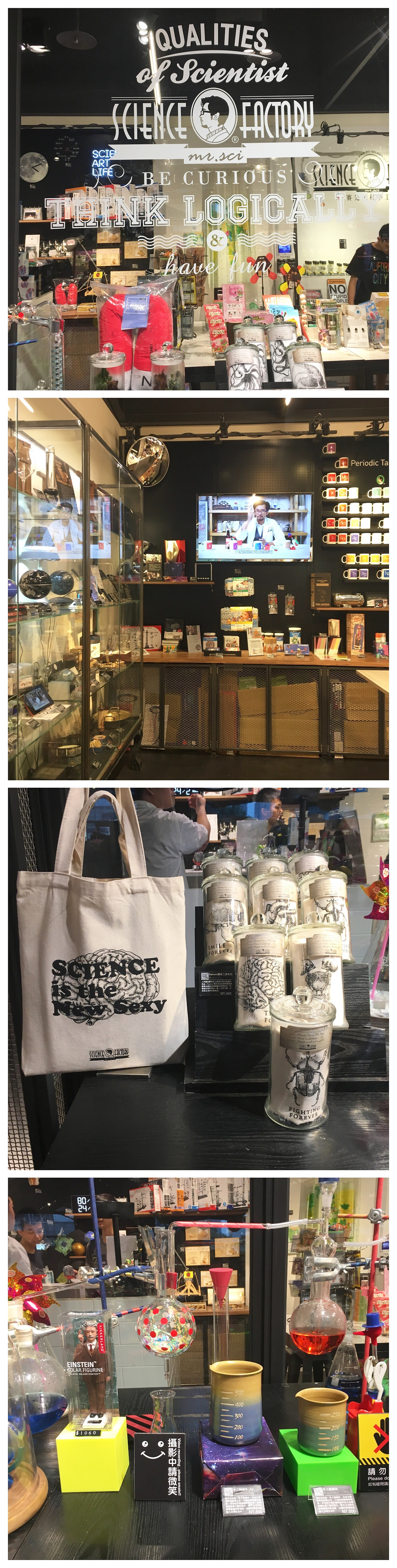 대만 the eslite spectrum안에는 라이프 스타일샵으로 가득한데 그 중에 독특한 제품으로 눈길이 가는 곳이 있습니다. 멀리서 보면 실험실에서 보던 과학 용품이 잔뜩 있는 듯한 느낌인데 가까이 다가가서 보면 비커처럼 생긴 컵부터 실제로 과학을 응용한 디자인 제품들이 즐거움을 줍니다. 브랜드 소개를 보면 심심하고 나른한 삶에 Mr. Sci Science Factory 제품들은 우리의 호기심을 자극해 과학적 흥미를 가져와 삶을 즐겁게 만든다고 합니다. 단순한 재미가 아니라 우리를 생각하게 만드는 제품을 소개하는 것 입니다. 단순히 예쁘고 귀엽고 아름다운 제품이 넘쳐나는 곳에서 한번 더 생각하게 하고 신선한 자극을 주는 제품이 더 많아졌으면 좋겠다는 생각을 했습니다.