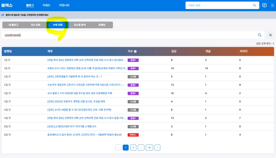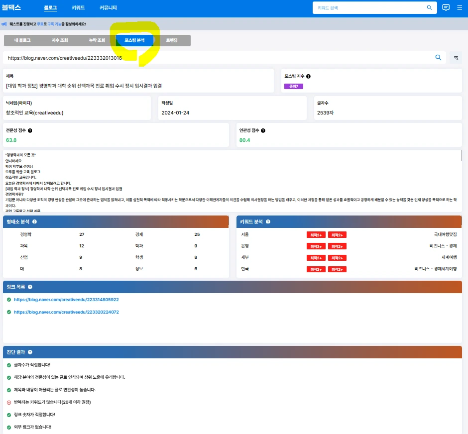 유료 사이트가 더 좋기는 하지만 블덱스라는 무료사이트도 충분히 유의미하게 사용할 수 있습니다. 블로그 지수, 게시물의 지수, 게시물 분석까지 다 해줍니다! 이러한 지수들을 확인해가면서 자신의 글이 노출이 잘 되도록 노력해야 합니다!