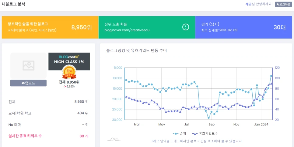 아래의 블로그 차트도 참고가 됩니다! 저는 개인적으로는 유효키워드의 개수를 보기 위해서 블로그차트에 들어오고 있습니다. 유효키워드가 많아야 그 키워드로 검색해서 들어오는 방문자 수가 늘어날 수 있습니다!
