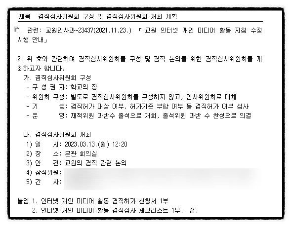 만약 겸직심사위원회가 구성되어 있지 않다면? 기존에 있는 인사위원회 등으로 대체할 수 있기 때문에 이 역시 인사위원회 담당자에게 문의해야 합니다! 제가 겸직을 받을 때도, 겸직심사위원회가 구성되어 있지 않아서 아래와 같이 처리했습니다.