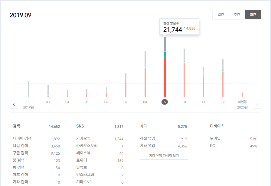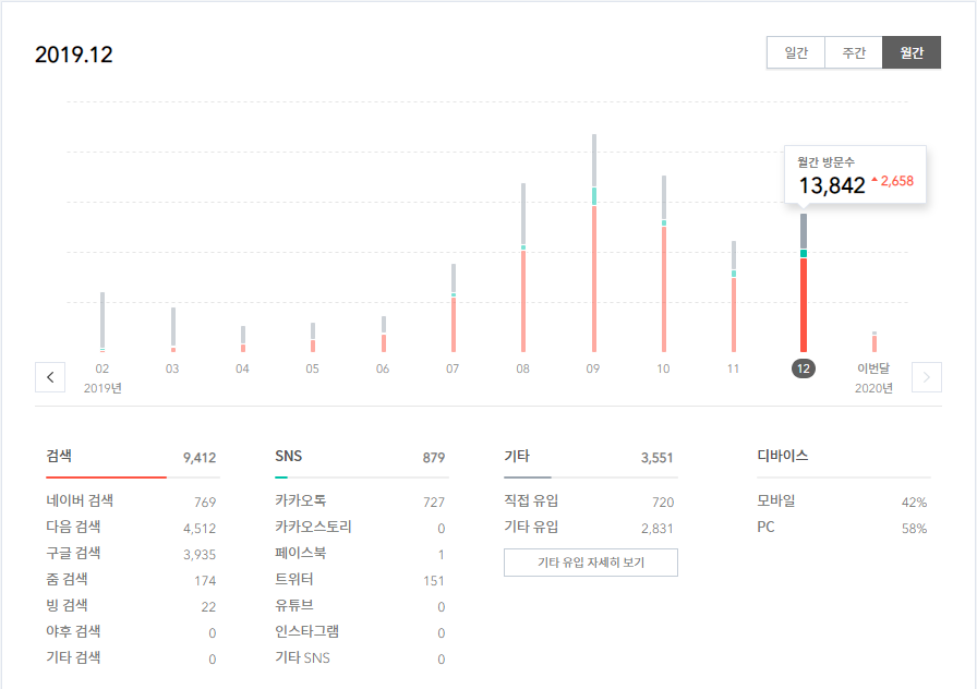 글이 글답게, 그리고 누군가에게 도움이 되고자 하는 글을 쓰려고 노력했습니다. 그리고 9월의 많은 방문자 수와 별개로 그다음에 점차 하락했지만, 12월부터 다시 방문자수가 증가하는 것을 확인할 수 있습니다.