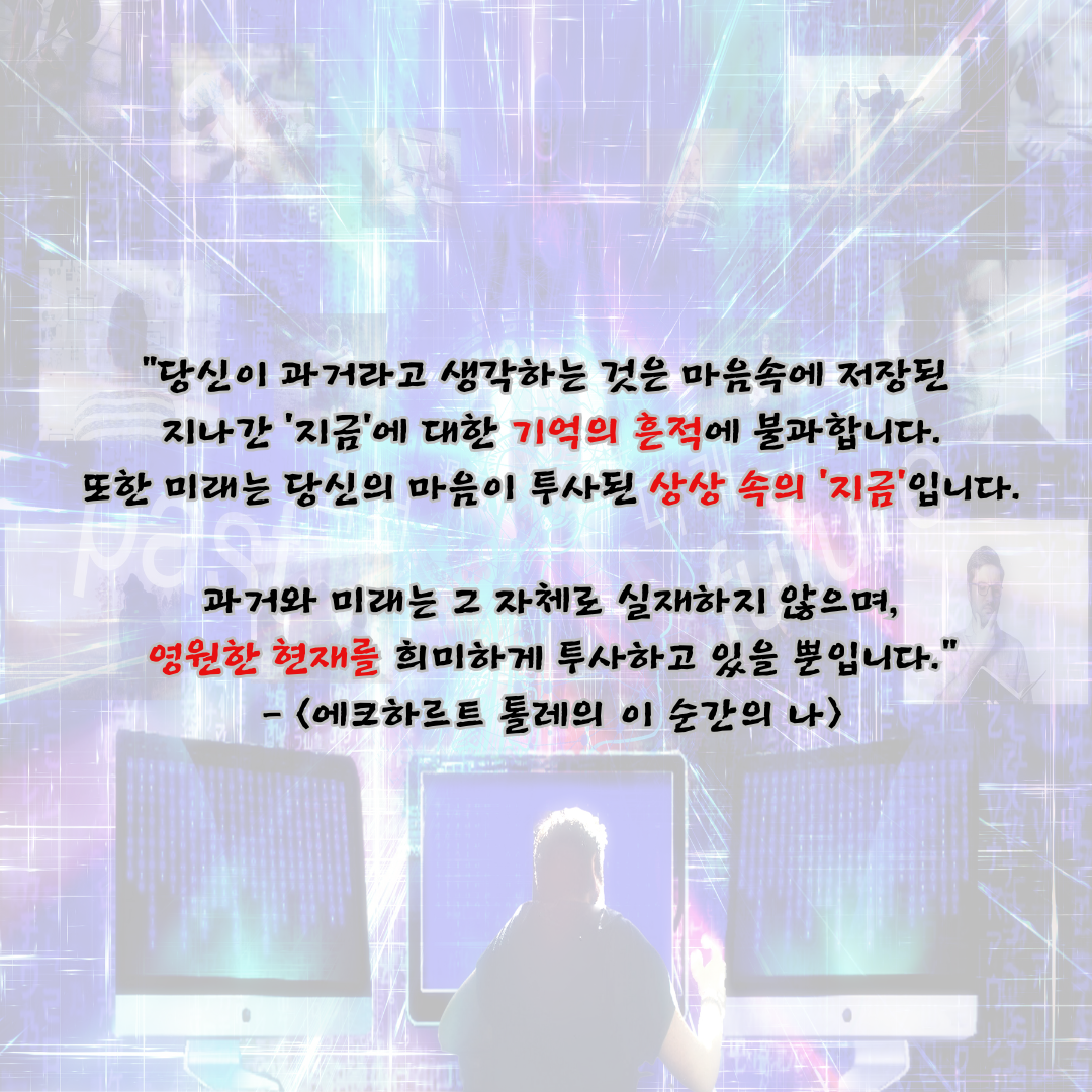 ‘과거’와 ‘미래’라는 것은 따지고 보면 우리 머릿속에 떠오르는 ‘기억’ 과 ‘생각’에 불과하다. 그리고 ‘생각’이라는 것은 기분이나 상황에 따라 자주 바뀌고 다르게 재해석된다. (물론 여기서 얘기하고자 하는 것은 우리가 일반적으로 의식하는 과거와 미래이다. 물리학에서 얘기하는 상대적 시간개념이 아니다.)