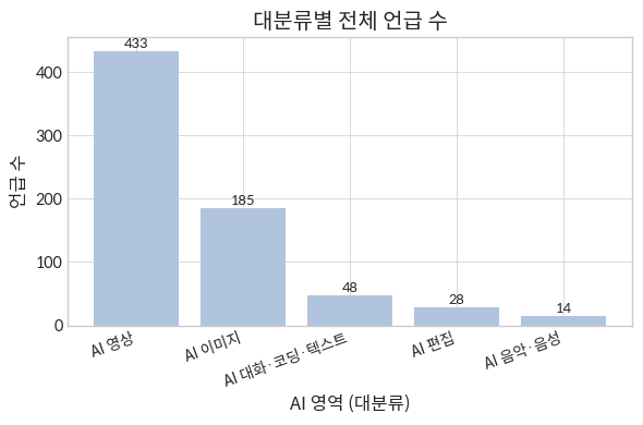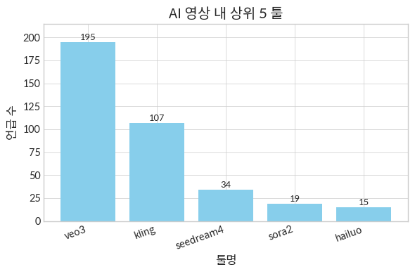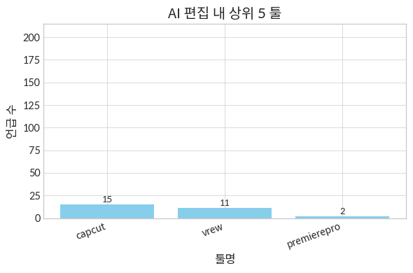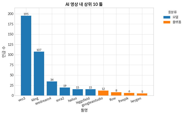 AI 편집(28회), AI 음악·음성(14회)은 상대적으로 적은 비중이었지만, 영상 중심 워크플로우에 결합되는 형태로 활용되고 있었습니다.