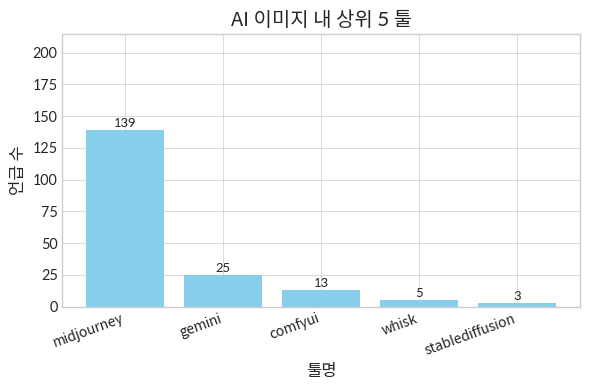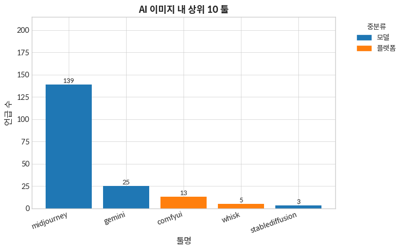 그 중 Midjourney(139회)가 절반 이상을 차지하며, 이미지 생성의 대표 툴로 자리 잡고 있습니다.
