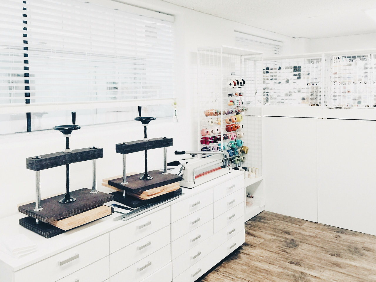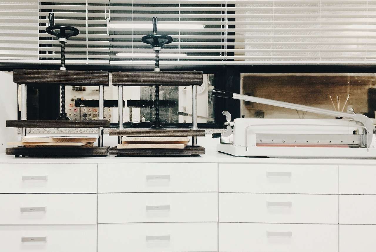 노트의 모양이나 각을 잡아주는 북프레스. 원하는 크기로 종이를 자를 수 있는 재단기. 재단기를 직접 써볼 일은 없지만, 전문가용 북프레스는 수업 때마다 사용해요. 하나 장만하기엔 비싸서 집에선 미니 북프레스를 쓰고 있답니다.