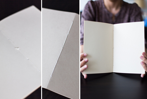 본드로 붙이는 떡제본이 아니라 실로 엮는 바인딩. 속지 곳곳에 자리 잡은 실에 자꾸 눈길이 가고, 만져보게 돼요. 아, 쫙 펼쳐진다는 장점도 있어요. 그리고 종이를 반 접어서 속지를 만들기 때문에 속지 끝이 뾰족뾰족. 재단기로 잘라낼 수도 있는데, 전 수제노트만의 매력이란 생각이 들어서 자르지 않아요.