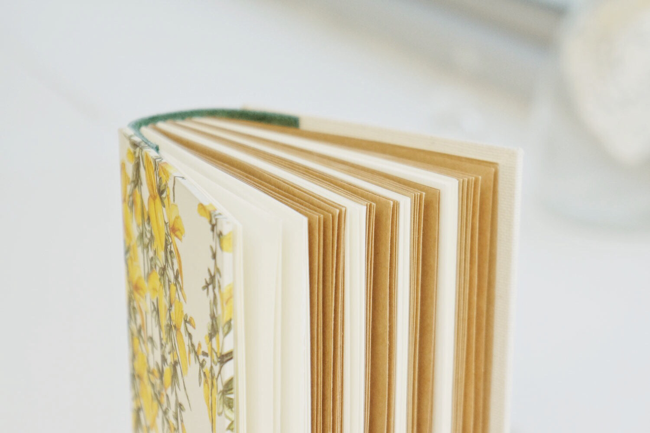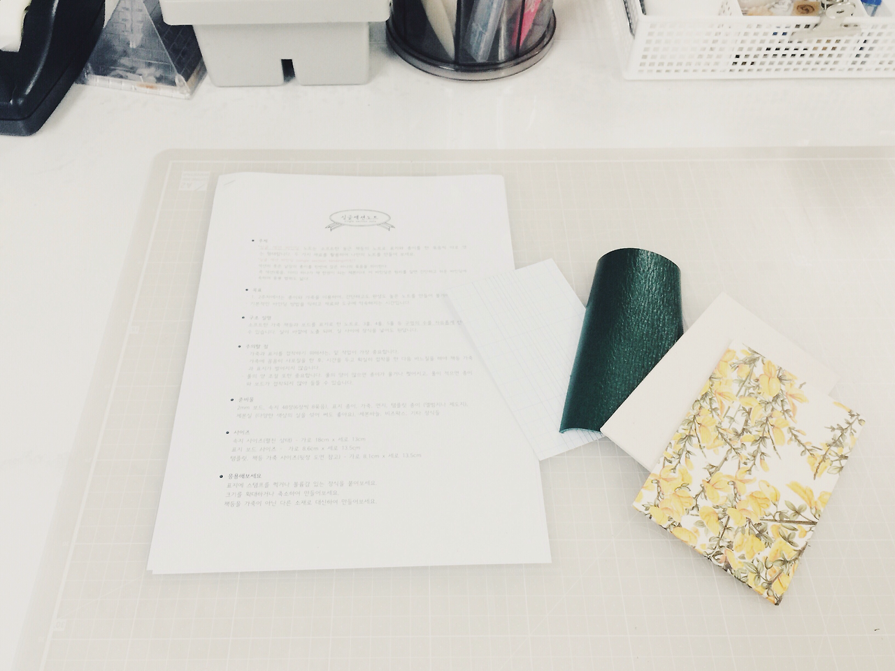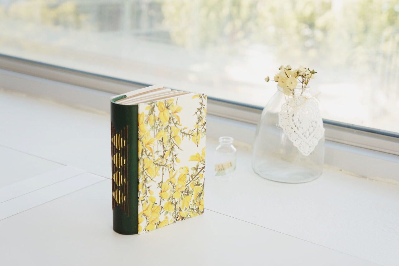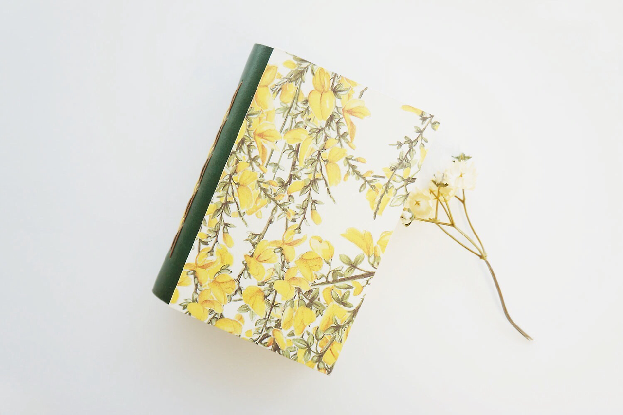 제가 플라워 패턴에 굉장히 열광하는지라 개나리가 한가득 피어있는 이탈리아 수입지를 골랐어요. 봄을 알리는 개나리. 첫 수업, 첫 노트와 잘 어울리는 종이죠? 노란 개나리와 어울릴 녹색 소가죽, 뒤표지로 린넨 느낌의 네덜란드 북클로즈Book cloth, 그리고 표지 안쪽의 면지End paper로 참나무 질감을 살린 종이를 사용했어요.