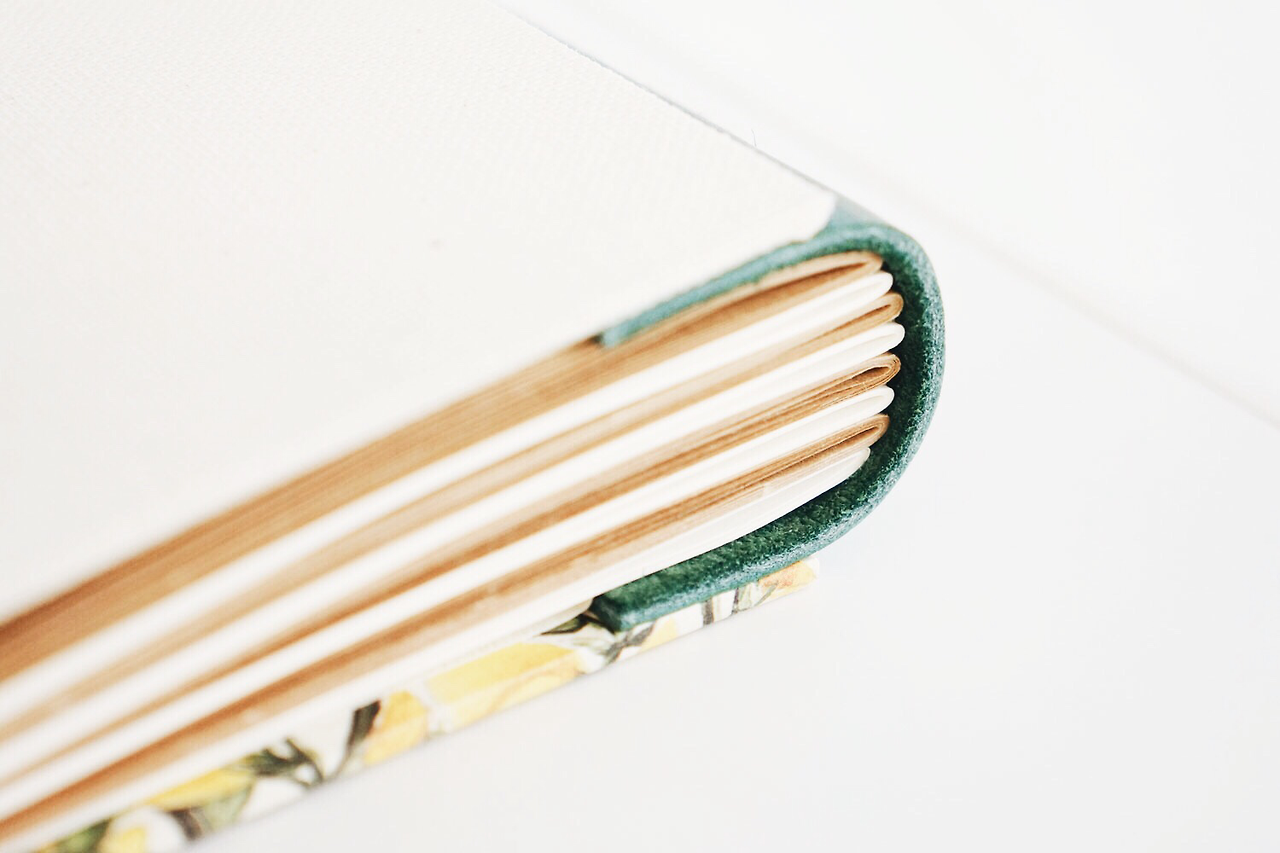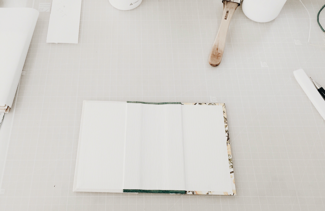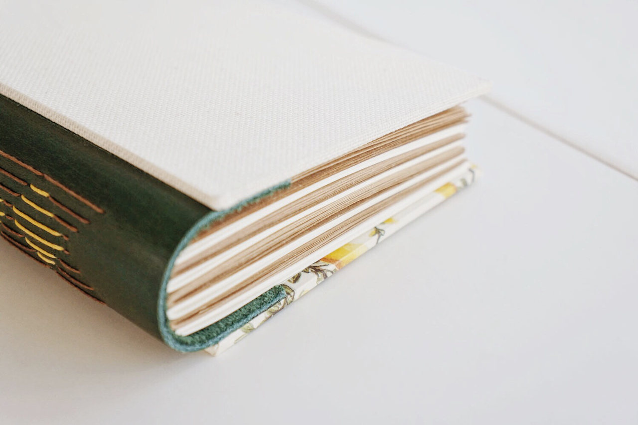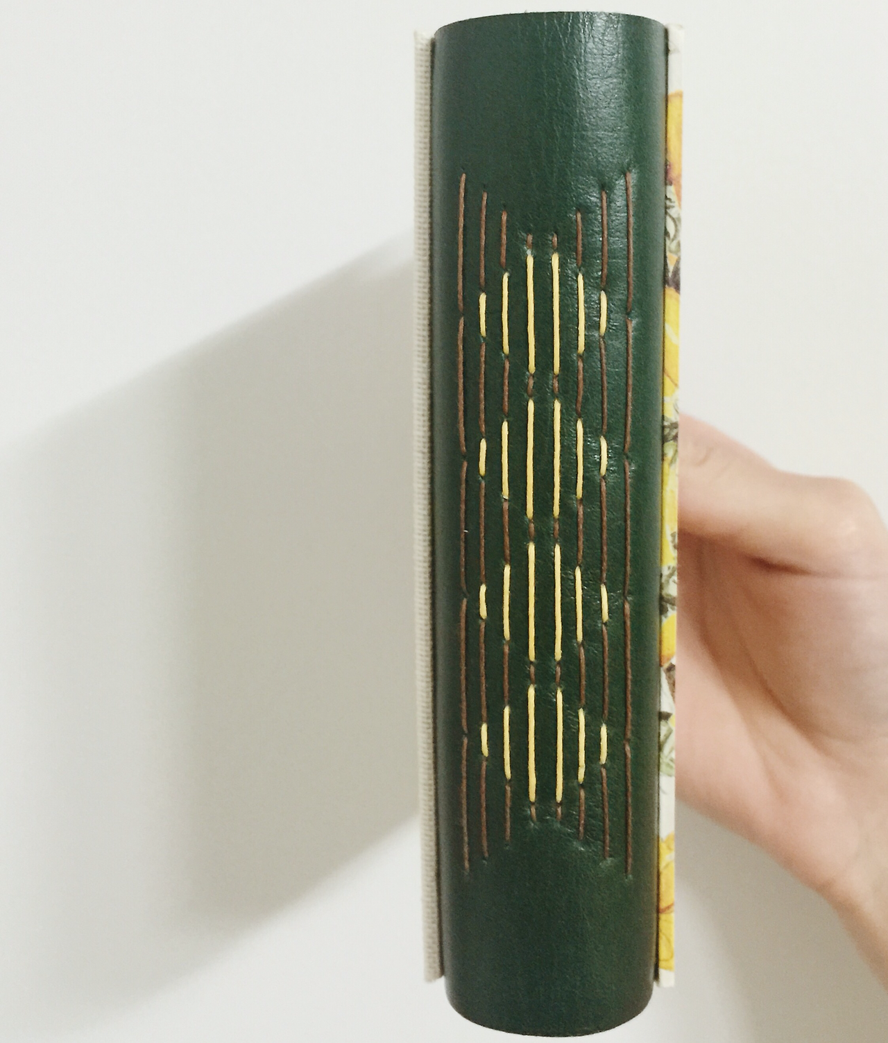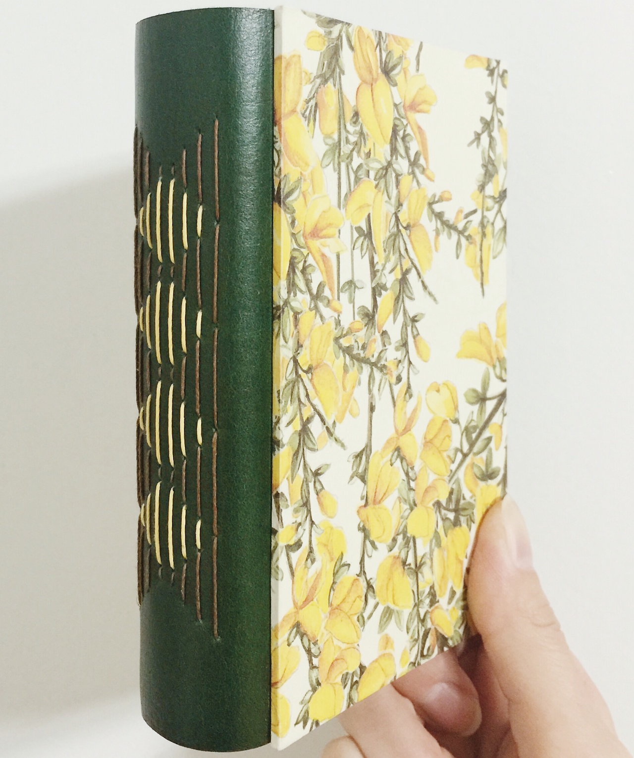 제가 플라워 패턴에 굉장히 열광하는지라 개나리가 한가득 피어있는 이탈리아 수입지를 골랐어요. 봄을 알리는 개나리. 첫 수업, 첫 노트와 잘 어울리는 종이죠? 노란 개나리와 어울릴 녹색 소가죽, 뒤표지로 린넨 느낌의 네덜란드 북클로즈Book cloth, 그리고 표지 안쪽의 면지End paper로 참나무 질감을 살린 종이를 사용했어요.