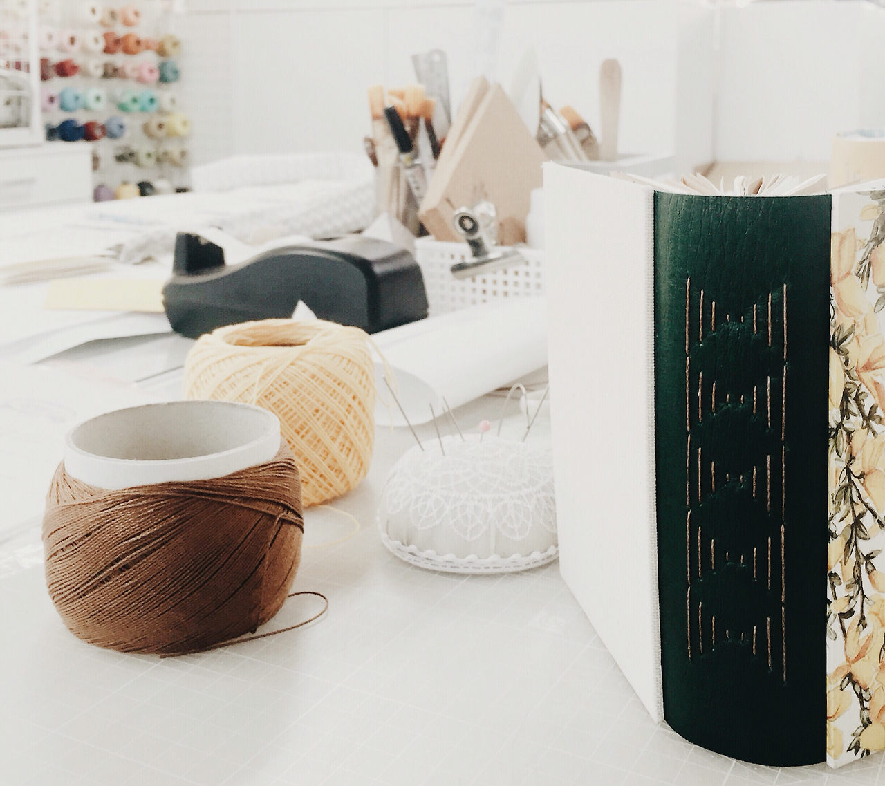 노트 만들 때 필요한 도구들. 선물로 받은 도구 세트는 집에서 복습할 때 유용하게 쓰고 있지요. 공방에는 같은 도구라도 다양한 종류가 갖춰져 있어서 이것저것 사용해 볼 수 있어요.