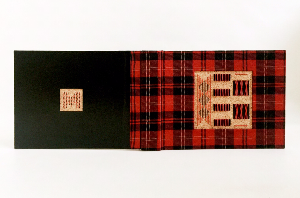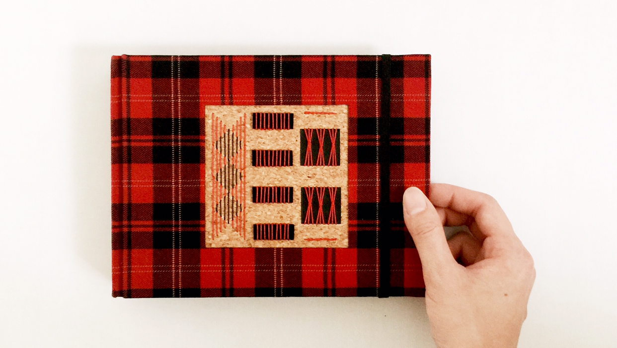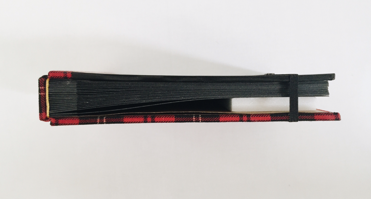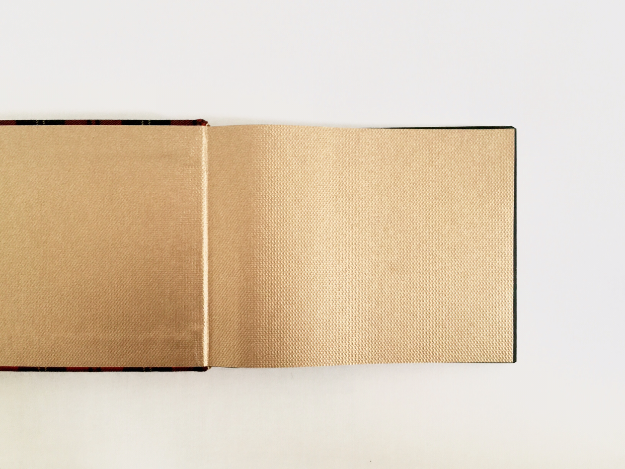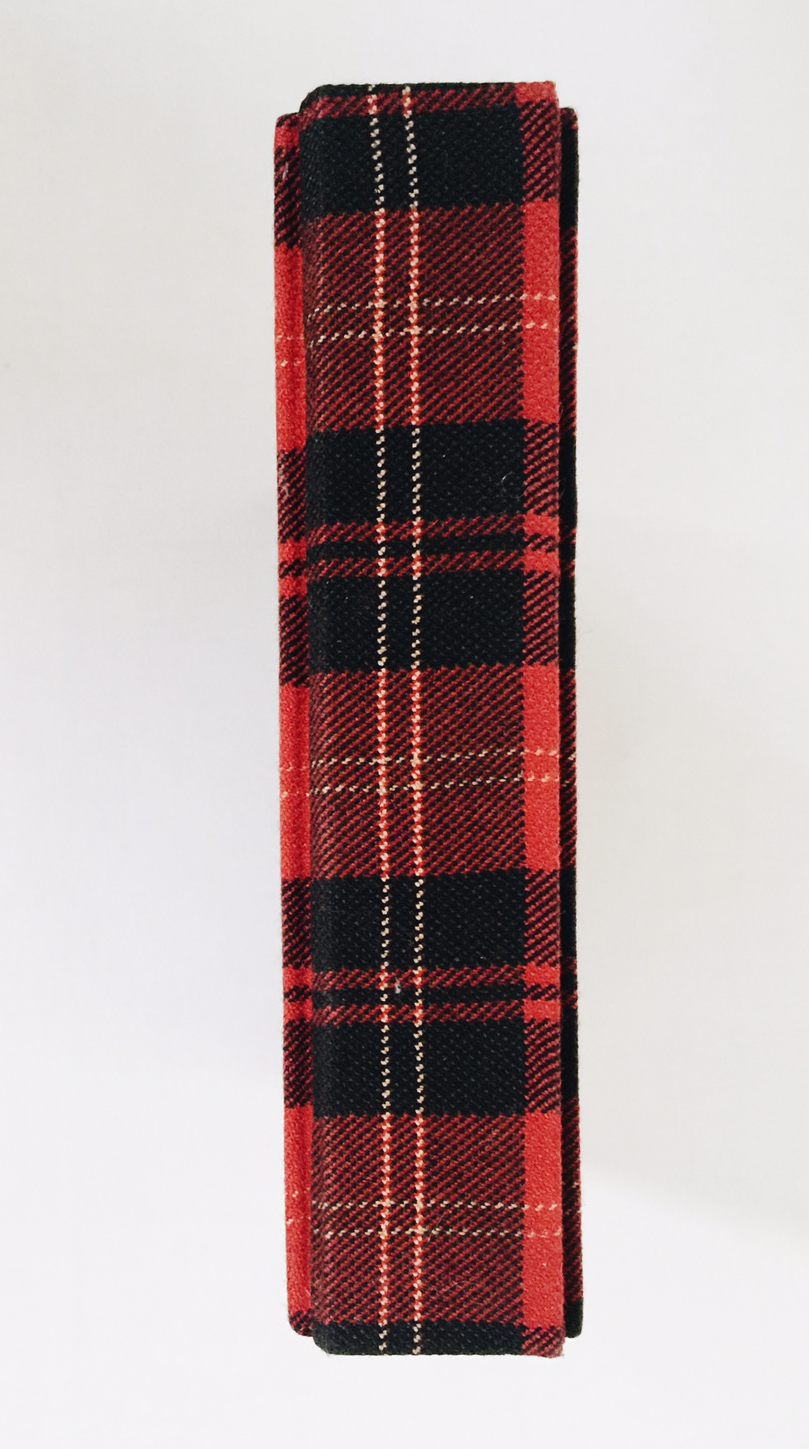 앞은 타탄 패브릭, 뒤는 천연 가죽 자투리로 만든 가죽지로 커버링. 패브릭과 가죽지 모두 두꺼워서 커버링하는데 시간이 꽤 걸렸어요. 두꺼울수록 힘이 많이 드는 데다 패브릭에 일정한 패턴까지 있어서 체크의 직선이 잘 맞도록 신경 써줘야 하거든요. 하지만 천이 책등에서 뒤표지로 넘어가면서 직각이 완전히 흐트러졌답니다. 흐물거리는 체크 보이시나요. 한순간 긴장을 놓치면 꼭 이렇더라고요. 하하하핳. 아쉬운 대로 앞표지만 깔끔한 커버링!