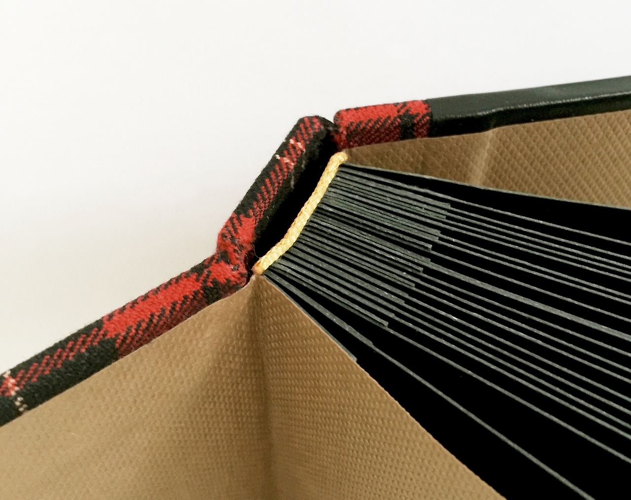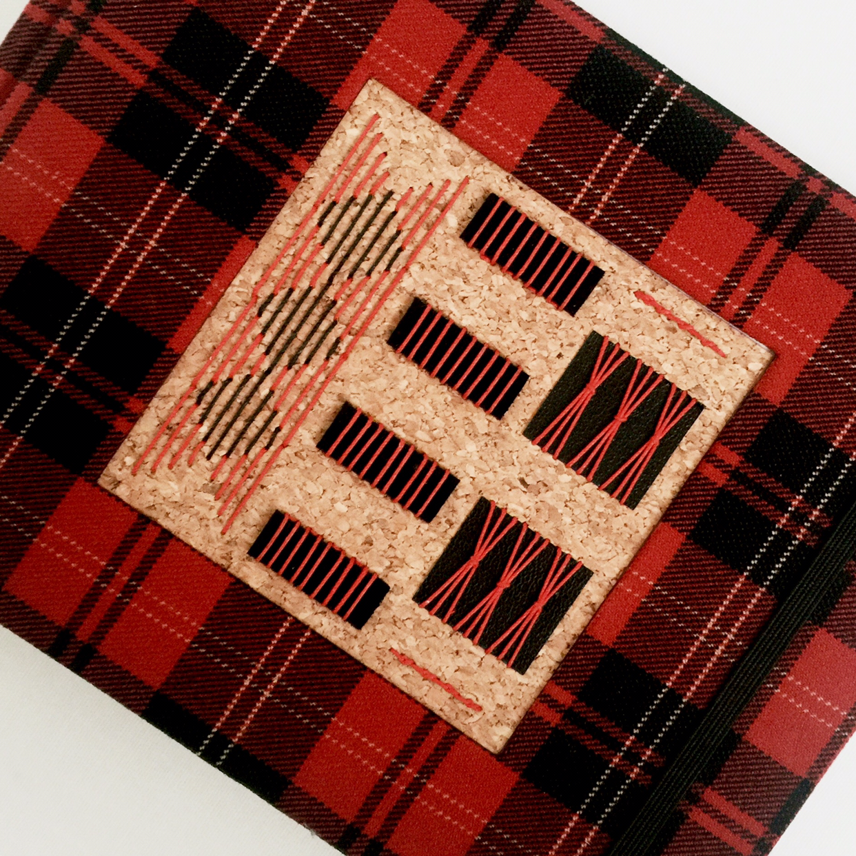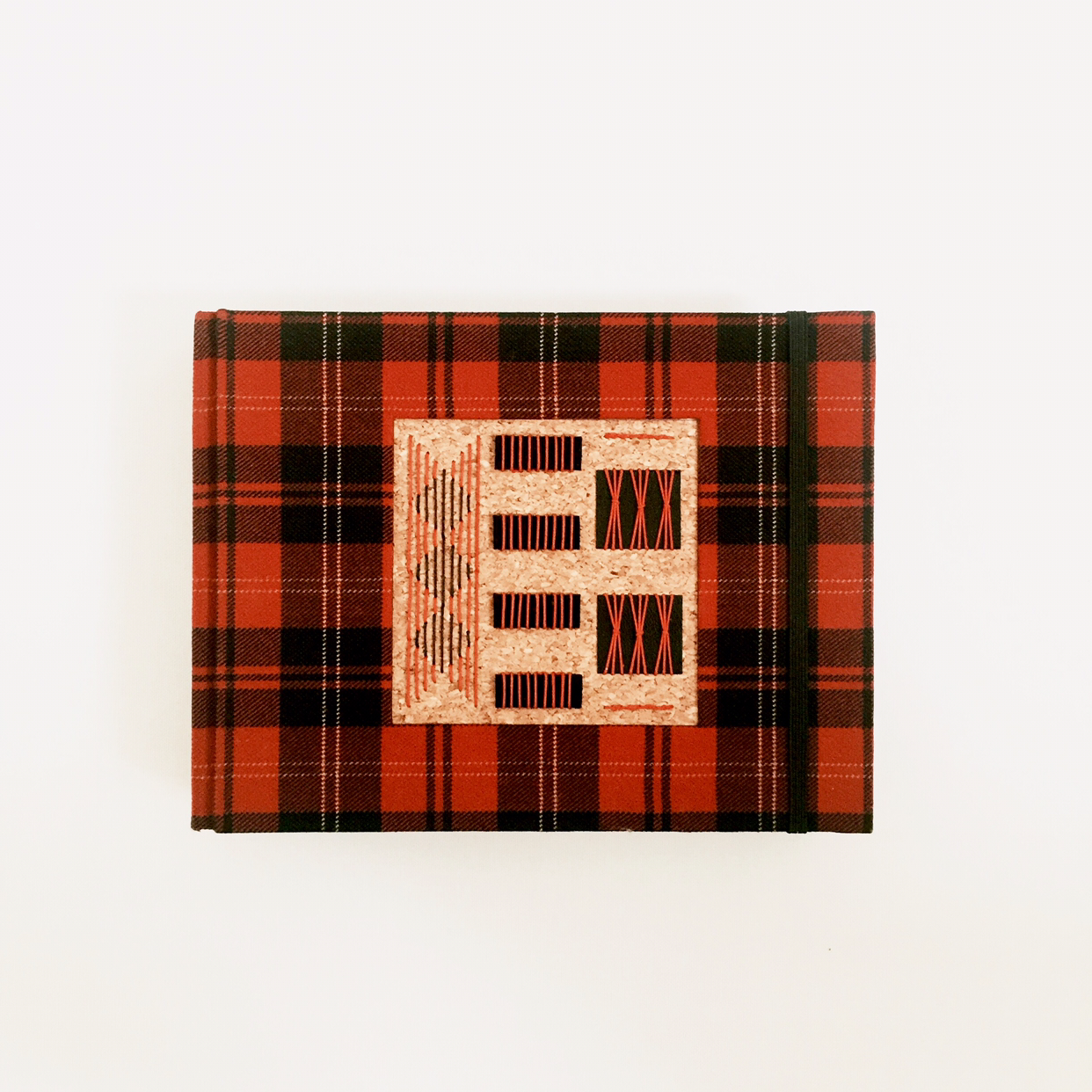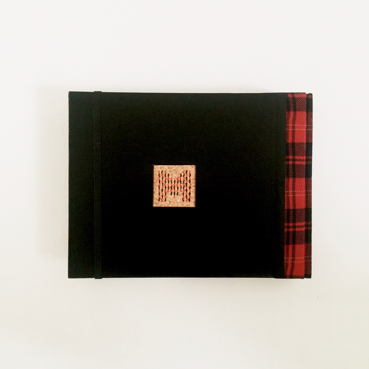 앞은 타탄 패브릭, 뒤는 천연 가죽 자투리로 만든 가죽지로 커버링. 패브릭과 가죽지 모두 두꺼워서 커버링하는데 시간이 꽤 걸렸어요. 두꺼울수록 힘이 많이 드는 데다 패브릭에 일정한 패턴까지 있어서 체크의 직선이 잘 맞도록 신경 써줘야 하거든요. 하지만 천이 책등에서 뒤표지로 넘어가면서 직각이 완전히 흐트러졌답니다. 흐물거리는 체크 보이시나요. 한순간 긴장을 놓치면 꼭 이렇더라고요. 하하하핳. 아쉬운 대로 앞표지만 깔끔한 커버링!