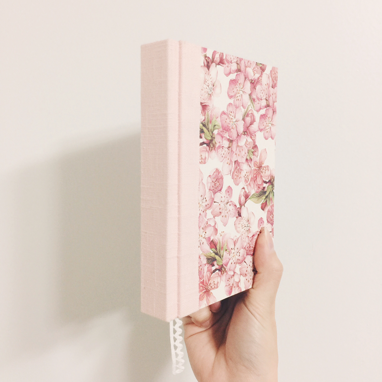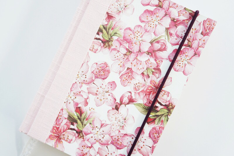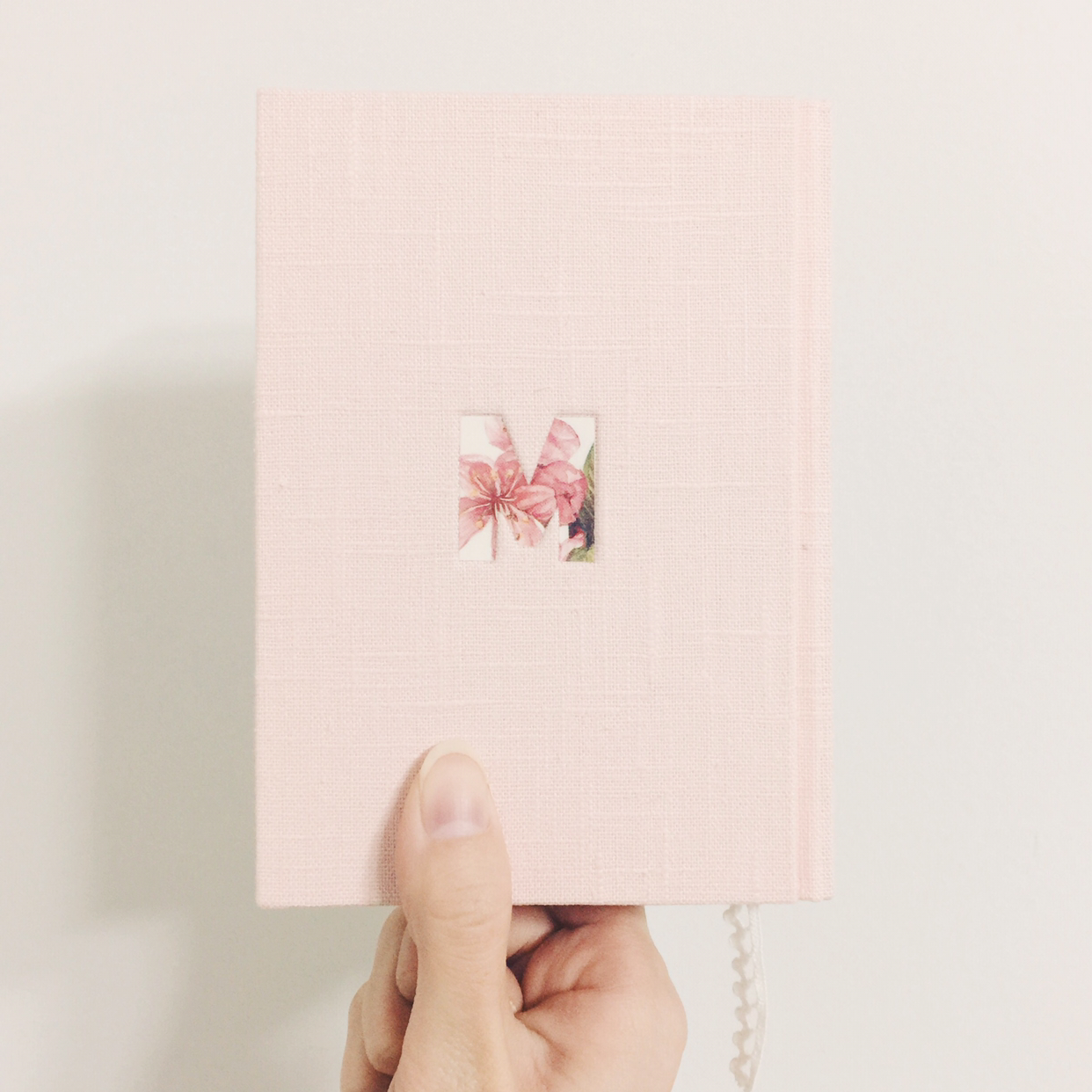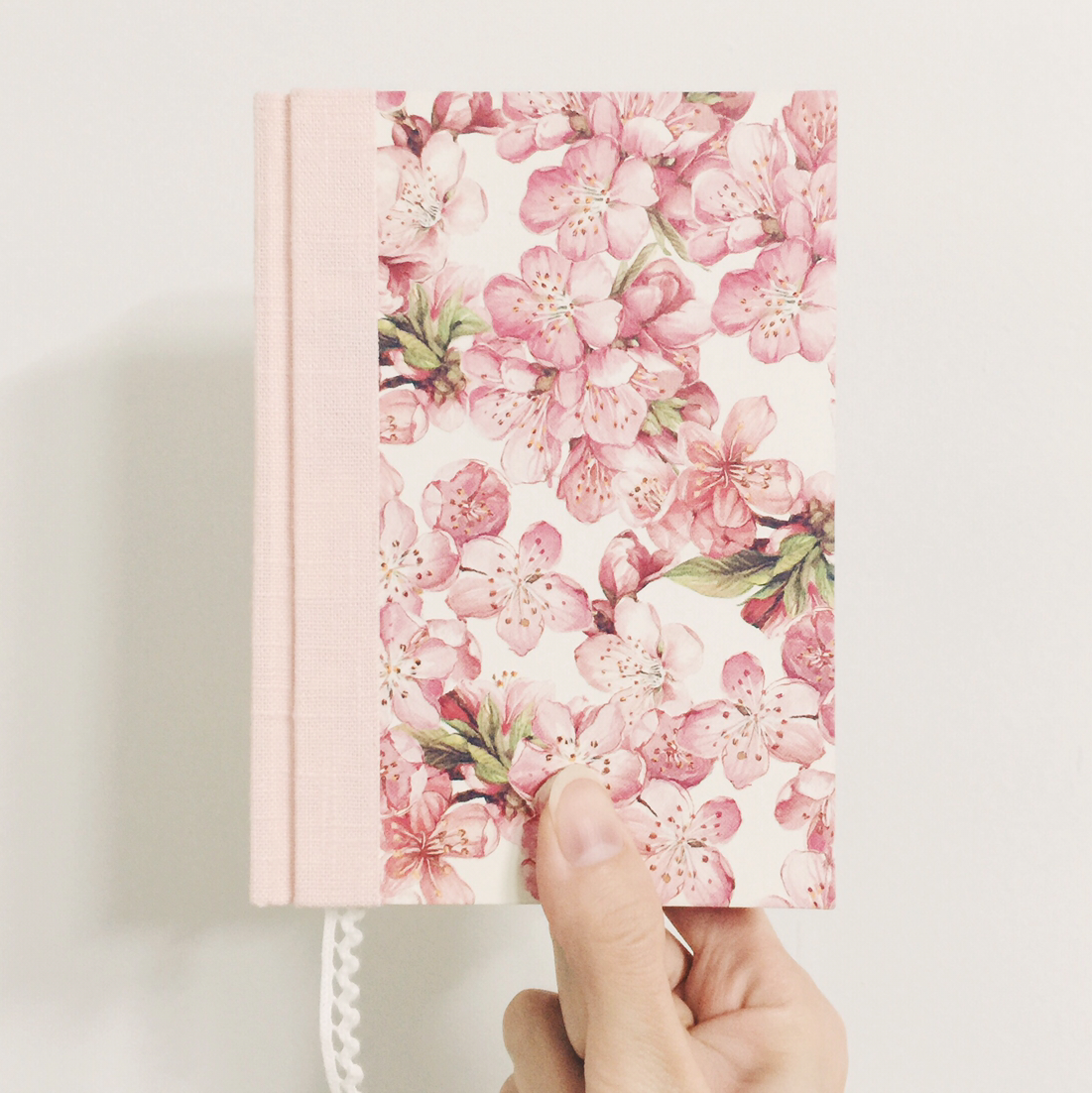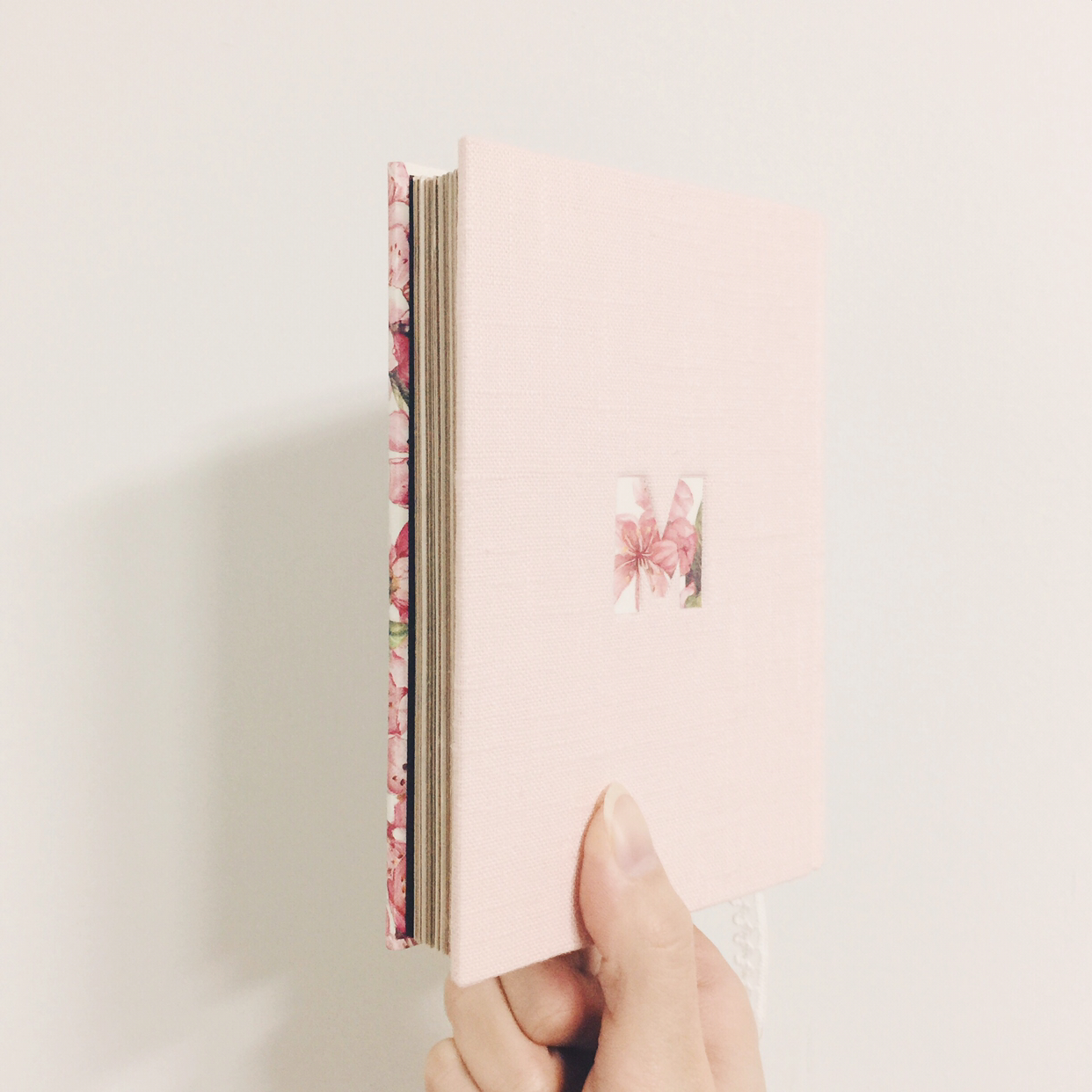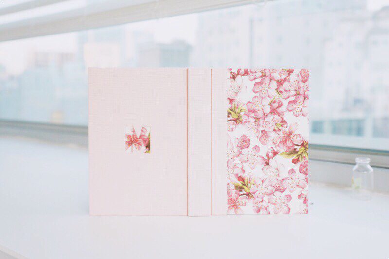 복숭아꽃의 꽃말은 나는 영원히 당신의 것. 낭만이 넘치는 피치 블라썸 패턴과 수줍은 분홍빛 북클로즈로 소녀 감성이 물씬 풍기는 양장 노트를 만들었습니다.