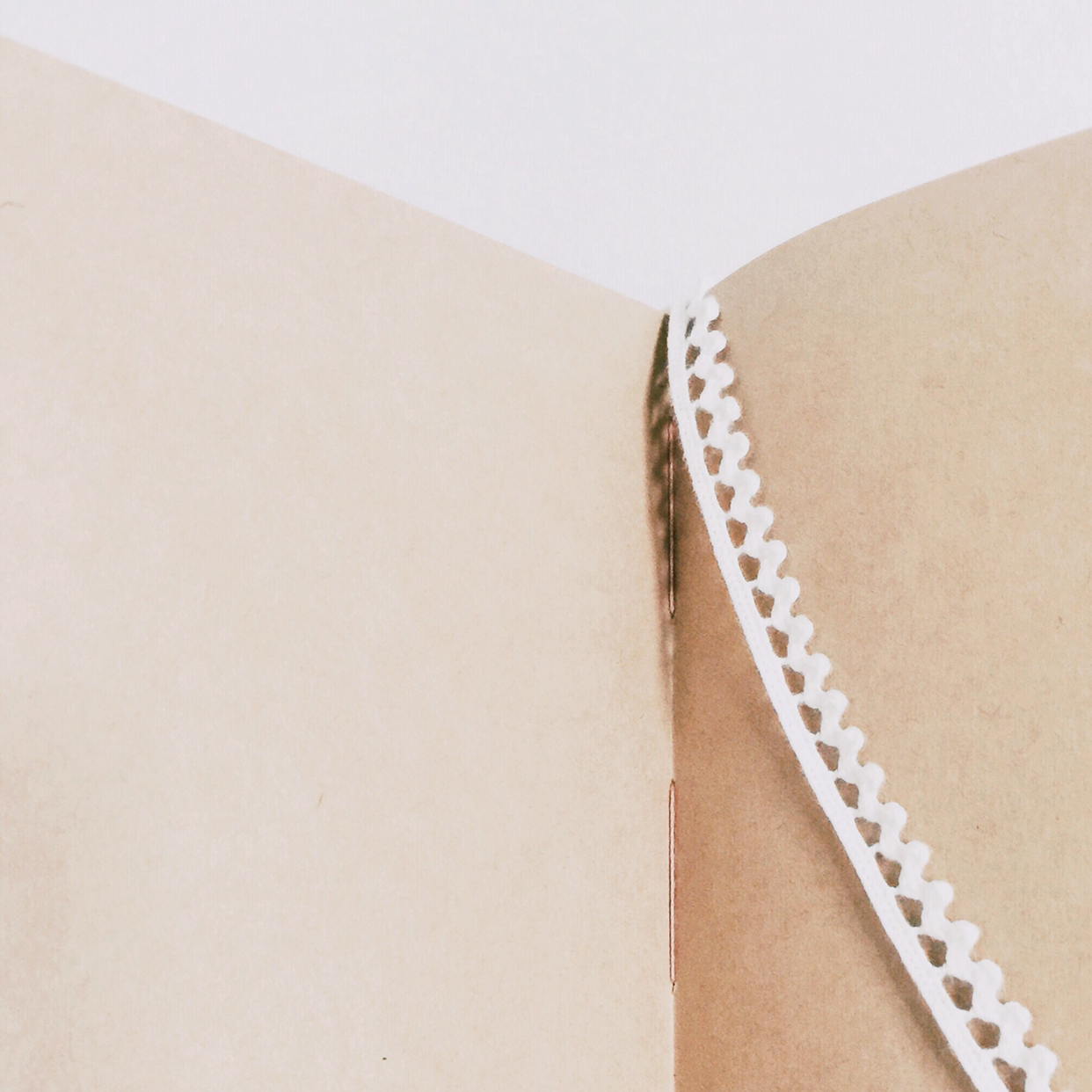 책등과 속지 사이에 먼지가 앉지 않도록, 꽃천 Head band 을 달아요. 차분한 크림색의 헤드 밴드를 덧대고, 가늠끔은 토숀 레이스로 소녀다운 분위기를 한껏 살렸어요. 내지로 미색지와 크라프트지를 한 장씩 번갈아 넣어주니 감성에 한 몫을 더하네요.