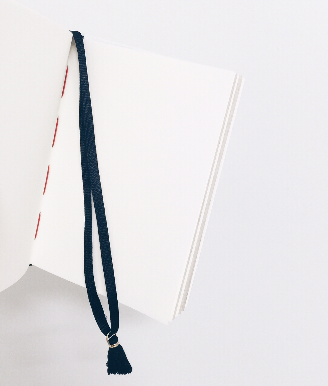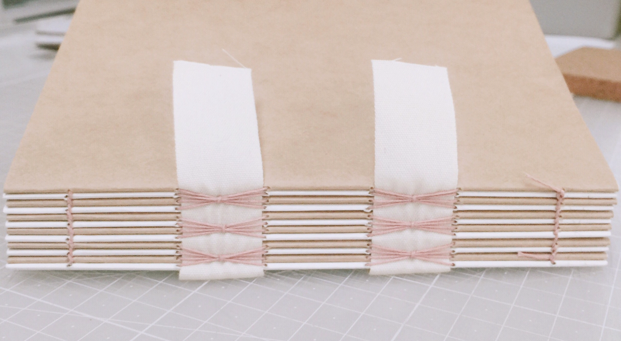 책등이 가려질 테지만, 수업에서는 노출 제본에도 활용할 수 있는 묶음 바인딩으로 속지를 엮었습니다. 가운데 매듭을 짓는 위치를 맞춰 정갈해 보이도록 했어요. 매듭 위치를 달리해 포인트를 줄 수도 있답니다.