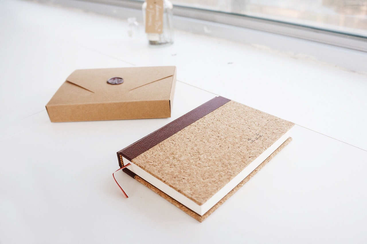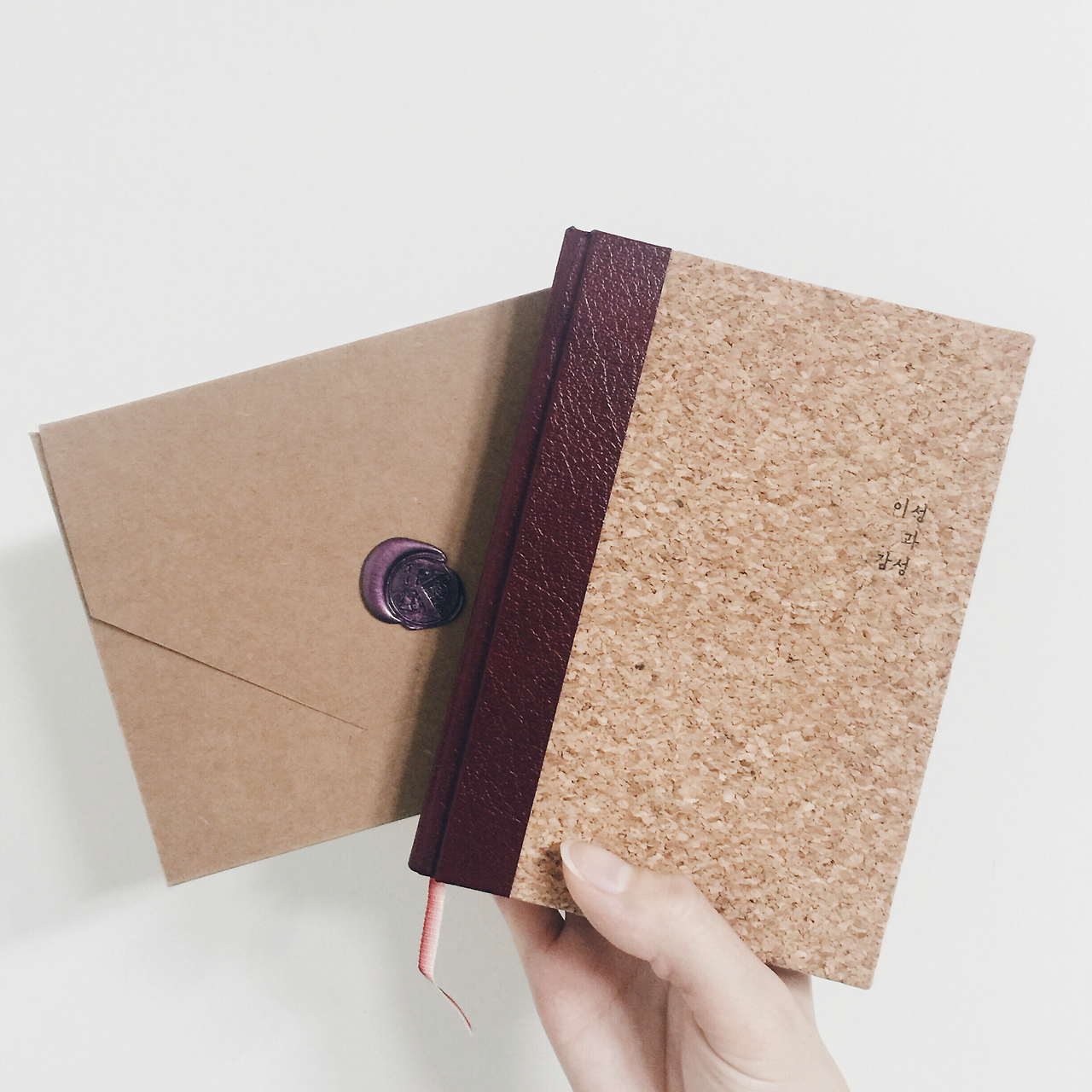 코덱스북 수업을 하기 전에 공방에서 진행하는 원데이 클래스 수업을 먼저 들었어요. 원데이 클래스에서는 코르크 페이퍼와 가죽지를 이용한 노트, 노트를 담을 수 있는 상자까지 만들어보았지요. 속지는 직접 실제본 하지 않고 본드 제본된 반제품으로. 약식(?)으로 만들어 본 뒤라, 정규 과정을 들을 때 수월하게 노트를 제작할 수 있었답니다.