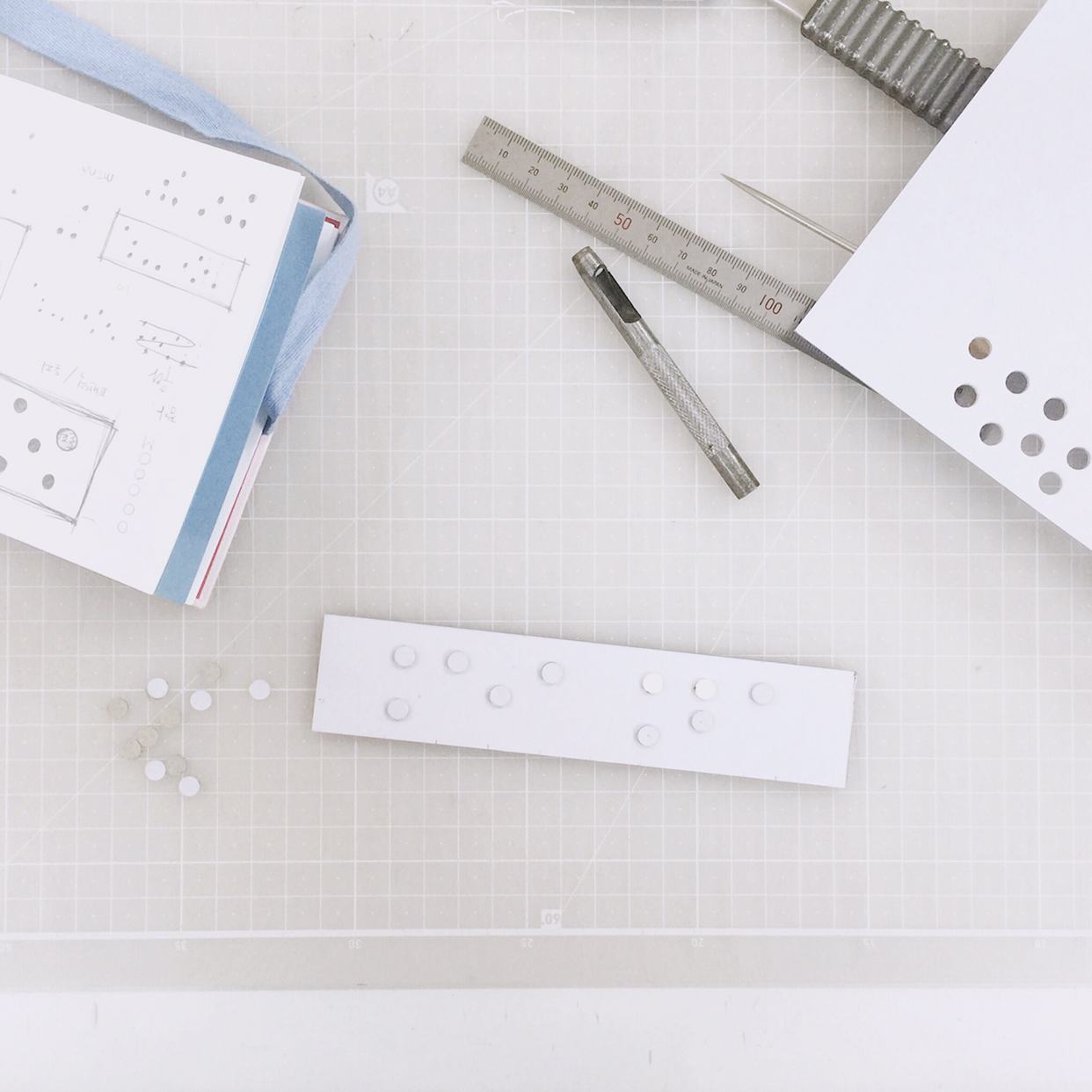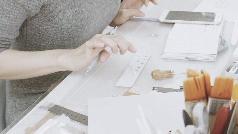 이번 수업에서는 책등에 엠보싱 효과를 주는 작업을 할 수 있었어요. 여러 방식을 고민하다 점자로 'mina'를 만들었네요. 아무나 뜻을 알 수 없는 점자. 손끝으로 어루만지면서 나만 의미를 읽어낼 수 있다는 점이 마음에 들었거든요. 이름보다 좋은 의미의 다른 단어를 고르는 편이 자연스러웠겠지만, 작업하다 보니 노트마다 이니셜 M을 담아 만들고 있던 터라 제 이름을 선택했어요. 나중에 연인에게 이름을 담아 선물해도 괜찮겠다는 생각이 불쑥 드네요.