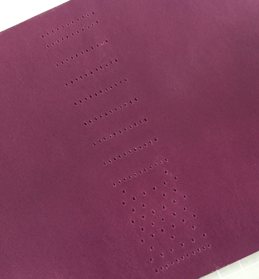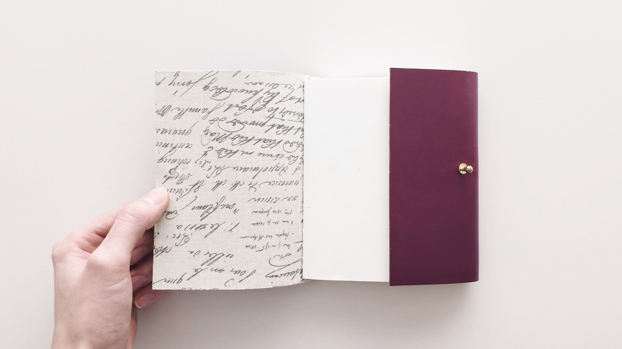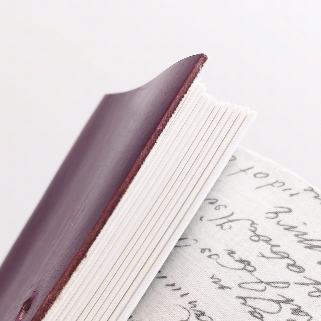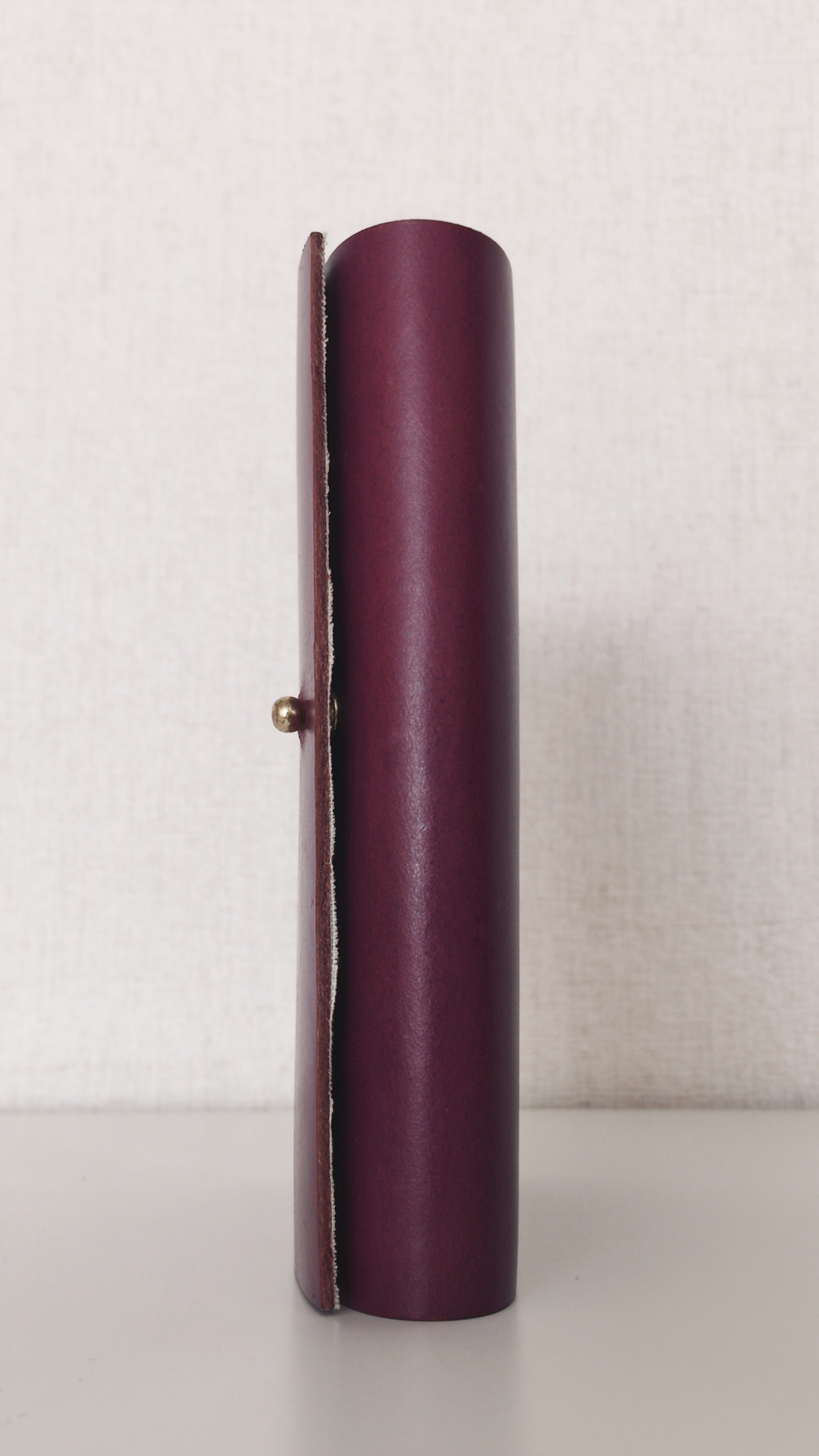 표지에 사용할 소가죽으로 보랏빛이 강한 자주색을 골랐습니다. 보통 노트의 가죽 표지로 빈티지 느낌이 강한 브라운 계열 색을 많이 쓰잖아요. 평소 잘 접할 수 없는 색으로 해보고 싶어 오묘한 빛깔의 가죽을 선택했어요.