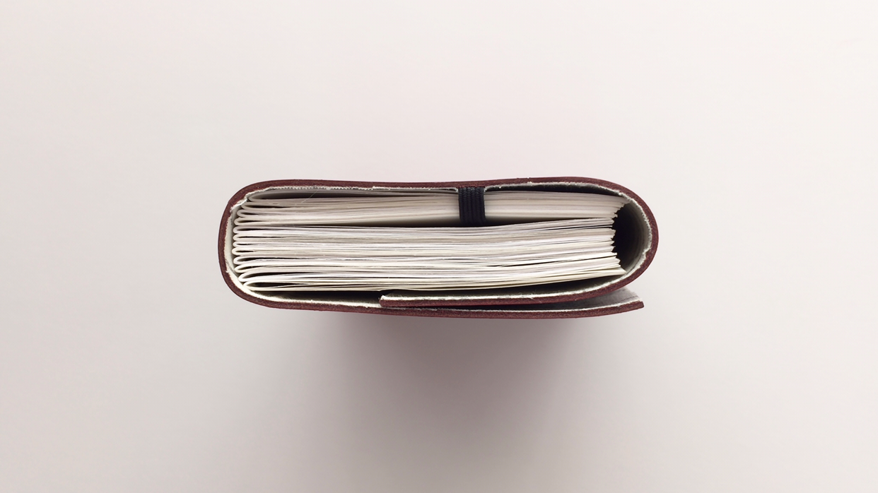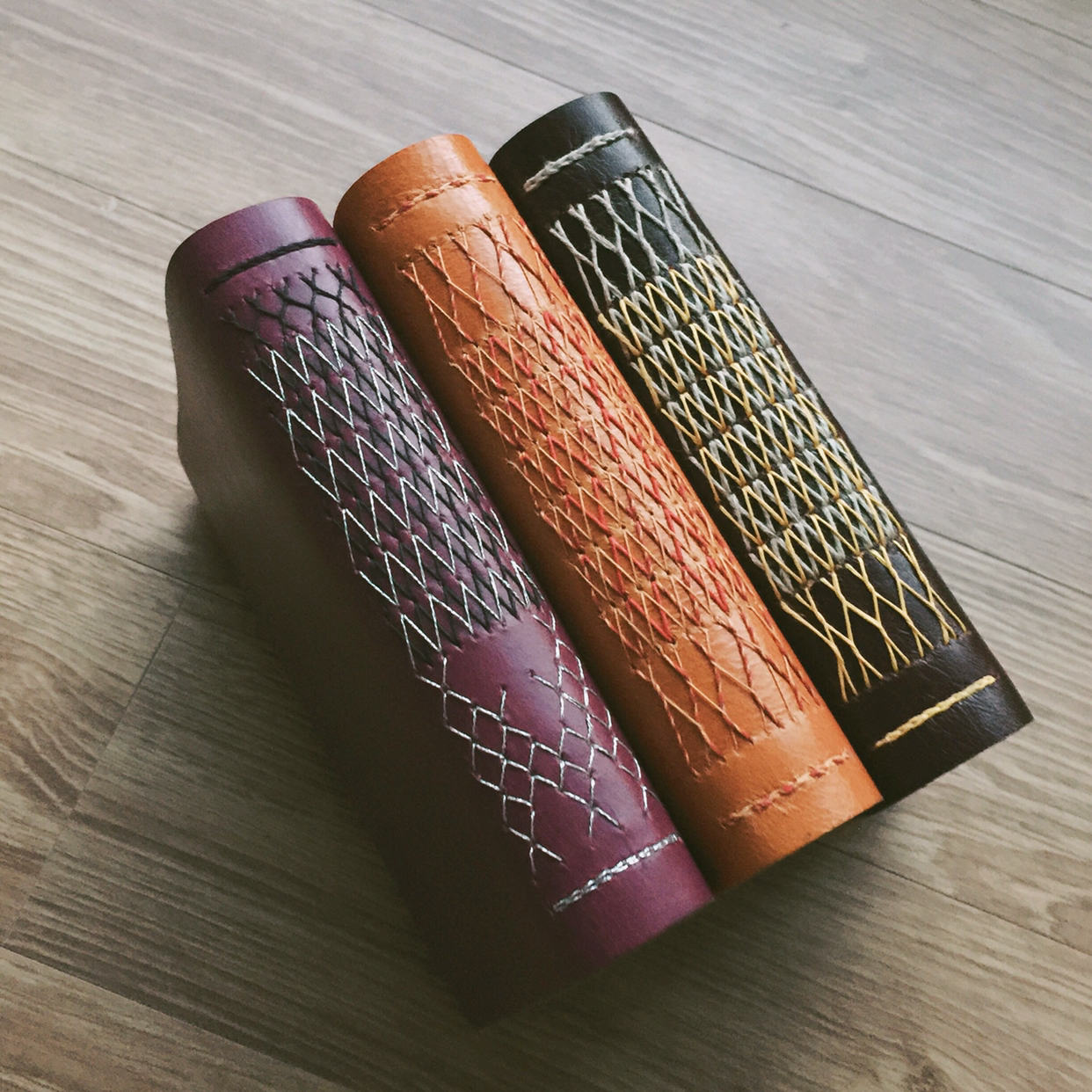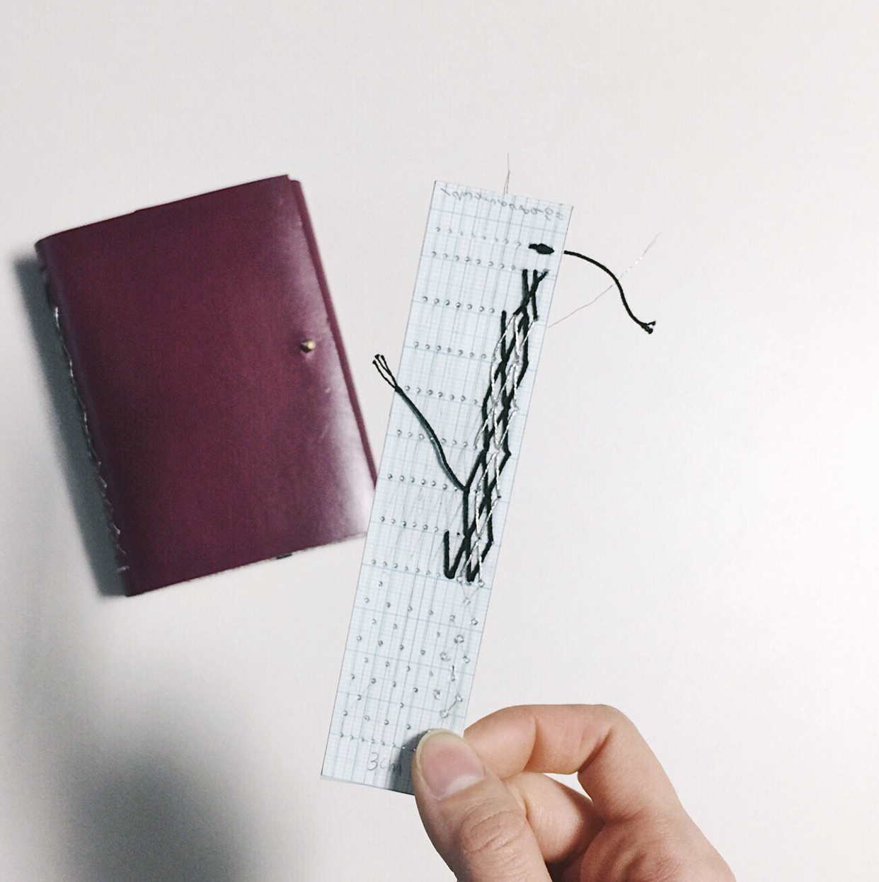 책등의 제본 기법은 위에서부터 차례로 링크 스티치 바인딩 - 프렌치 링크 스티치 바인딩 (거미줄 바인딩) - 2겹 X자 바인딩(아가일) - X자 바인딩(M) - 링크 스티치 바인딩 입니다. 링크 스티치는 이번 수업에서, 거미줄/X자 바인딩은 중급 과정 중 이전 수업에서 배운 기법이에요. 공방 선생님이 알려주시던 대로 바인딩을 했던 수업과 달리 프리 바인딩 수업에서는 도안을 고민하는 시간이 필요해요. 도안을 짜고도 제본을 하면서 풀고 엮기를 정말 많이 반복했어요. 이번에도 구멍만 150개 가까이 뚫었다죠. 쉽지 않은 과정인 만큼 보람이 몇 곱절로!