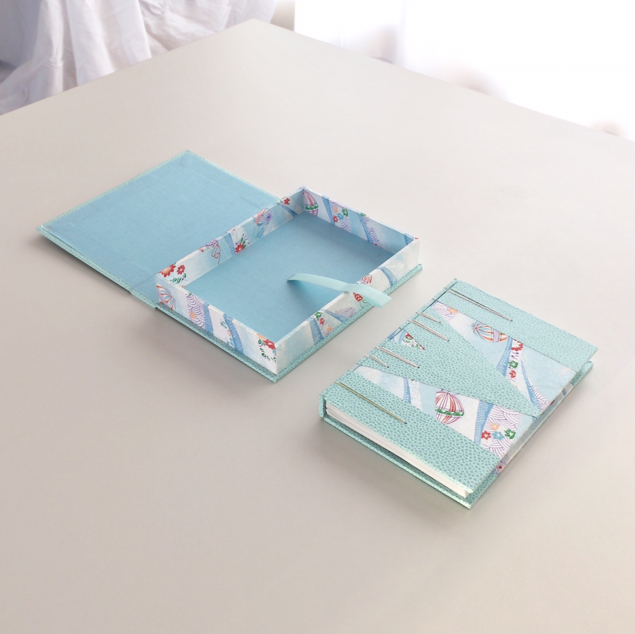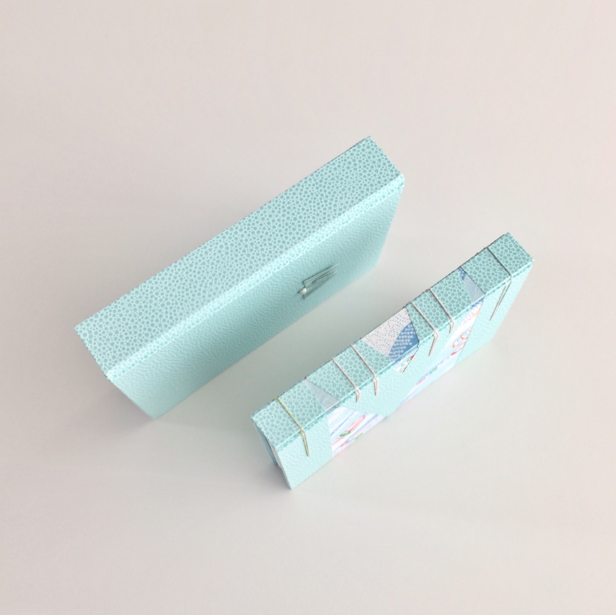 책 상자와 노트를 함께 만드는 고급 과정. 마침 한겨울에 노트를 만들기 시작해서 영화 <겨울왕국>의 색감을 떠올리며 재료를 골랐습니다. 눈을 보기 힘든 창원에서 공방을 오가던 터라, 서울이 너무너무너무 춥게 느껴졌어요. 손이 시려워 꽁! 발이 시려워 꽁! 그래서인지 차가운 색상에 눈길이 가더라고요. 민트색 가죽지와 하늘색 톤의 일본 화지로 시원 - 한 느낌의 노트와 책상자를 만들었습니다. 화지는 우리나라의 한지와 같은 일본 전통 종이에요. 질감도 한지와 비슷하지만 조금 달라요. 종이를 보면서 정말 이웃나라구나 했답니다.