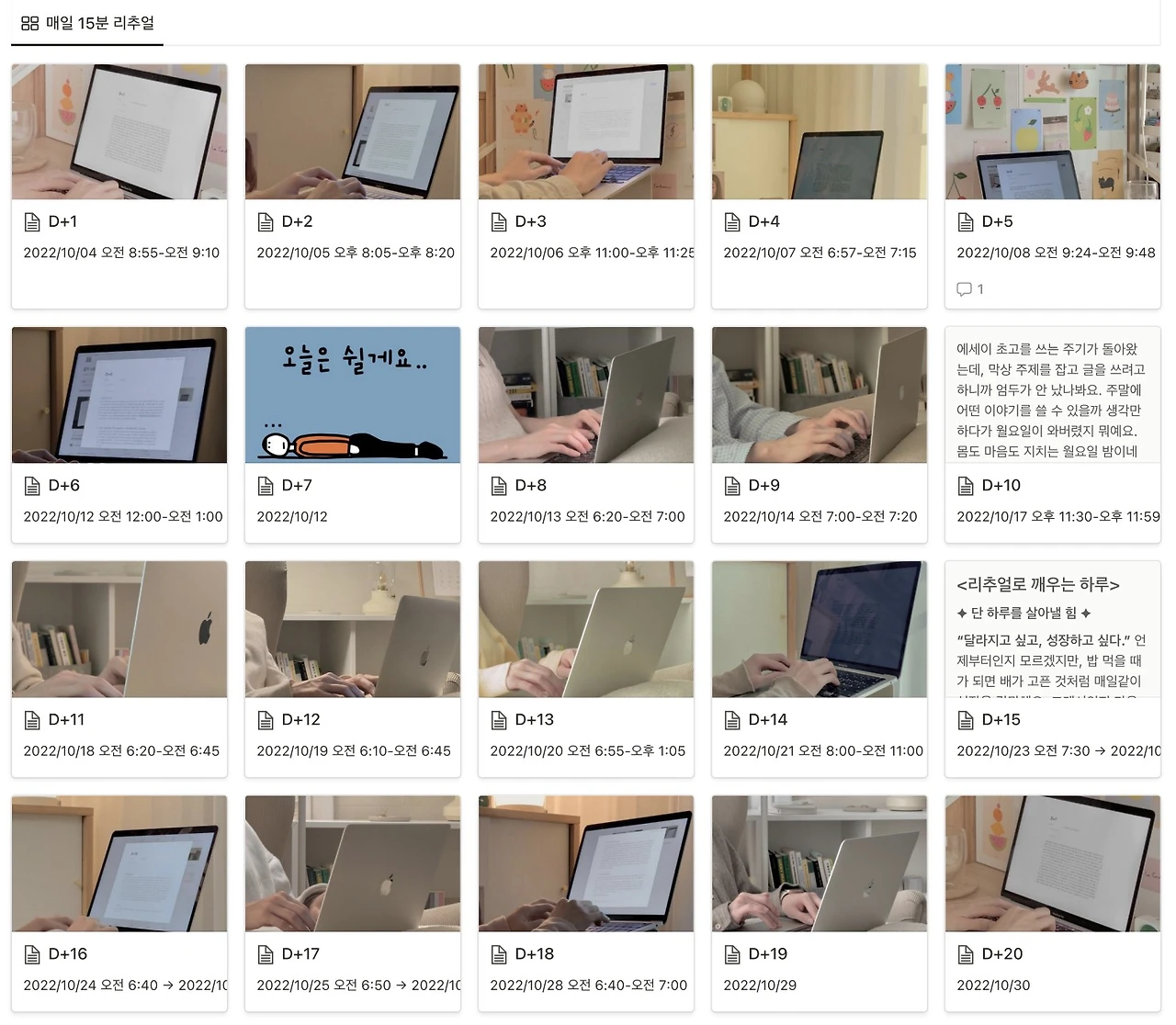 두 번째는 일상을 작게 잘라 쓴 글쓰기예요. 리추얼 첫 주에는 모닝페이지처럼 의식의 흐름대로 글을 쓰니까 생각이 어수선하게 돌아다니는 기분이었어요. 제게는 맞지 않는 방식이었던 거죠. 보리님이 진행한 밑미 리추얼에서 에세이 주제를 정하는 줌 미팅을 한 후에 한결 정돈된 글을 쓰기 시작했어요. 가장 집중해서 쓴 주제는 꾸준하기 위해 에너지를 쏟는 글쓰기 리추얼이었고, 마음에 안정을 주는 집 꾸미기와 회사에서 나를 잃지 않는 법까지 더해 일상을 세 가지 주제로 나누어 썼죠. 쓰다 보니 제가 매일 지내는 일상을 작은 주제로 나눠서 기록하는 셈이더라고요. 리추얼, 집, 일, 이 세 가지가 제 일상 전부라서요. 매일 겪는 일상을 작은 단위로 쪼개 그날 일어난 일과 느낀 감정을 한 두 줄이라도 꾸준하게 기록하다 보니 선명한 글쓰기를 할 수 있었어요. 매일의 기록을 보면서 제 삶에 대한 저의 견해가 분명하게 읽혔거든요. 날 것의 생각을 잘 다듬는 데에 글만 한 도구가 없다는 걸 새삼 깨달았고, 날마다 마음을 단정히 정돈하는 즐거움을 맛봤죠.
