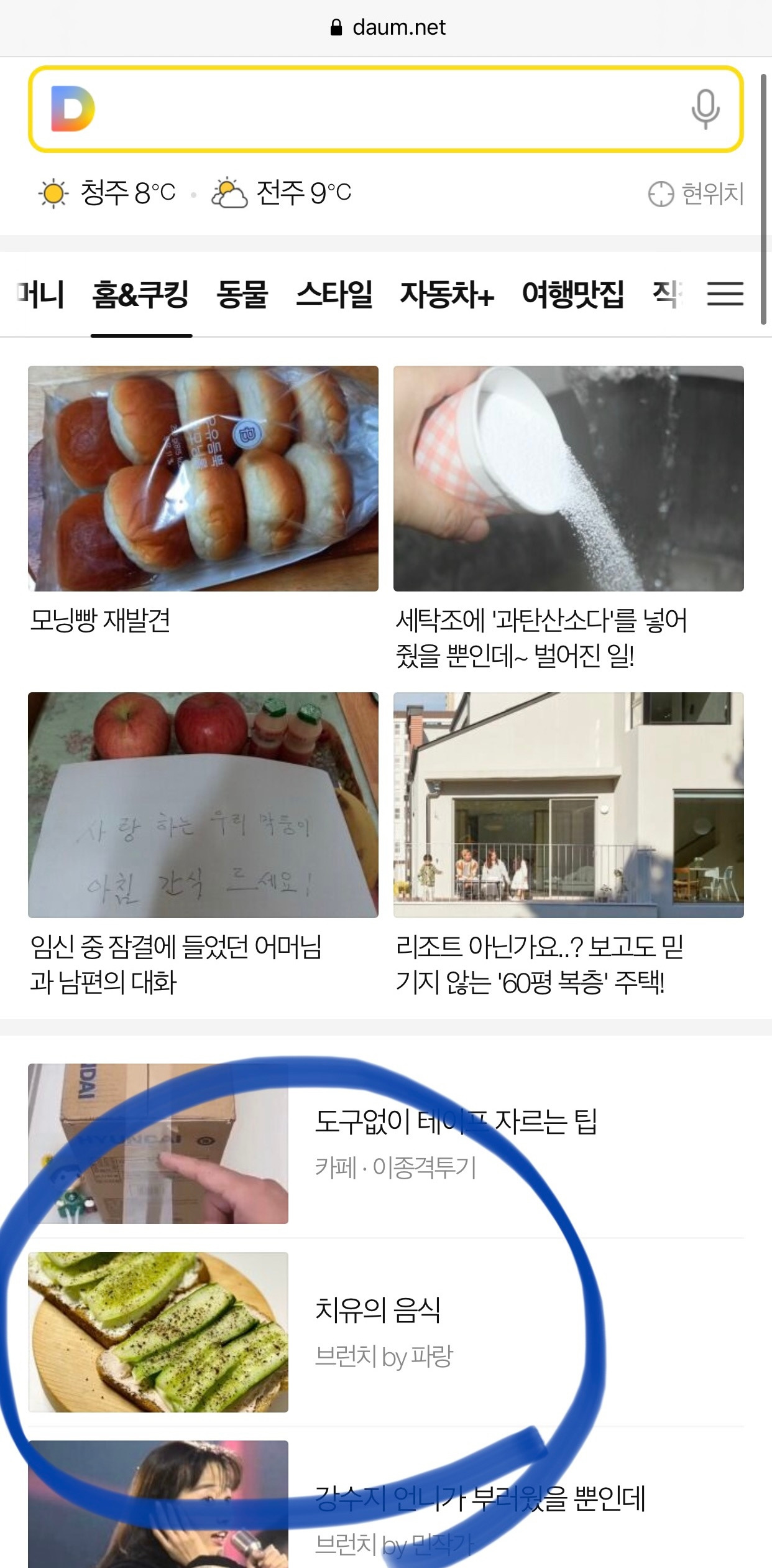 '엥?! 오이 샌드위치가?!' 두 눈을 의심하며 다음 메인 페이지를 들어가니 '홈&쿠킹' 카테고리에 내가 올린 오이 샌드위치 사진이 떡하니 보였다. 두 번째로 올라가게 된 것이다.