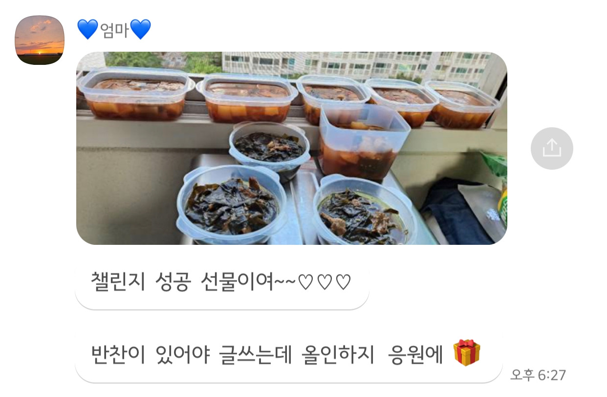 사진을 보곤 울컥하는 마음을 감출 수가 없었다. 장을 한가득 보시고 요리를 하시고, 1인분씩 소분하여 얼리기 위해 식히고 있는 사진. 내가 가장 좋아하는 집밥으로 챌린지의 성공을 축하해주시고 응원해주시는 엄마의 마음이 너무나 감사했다.