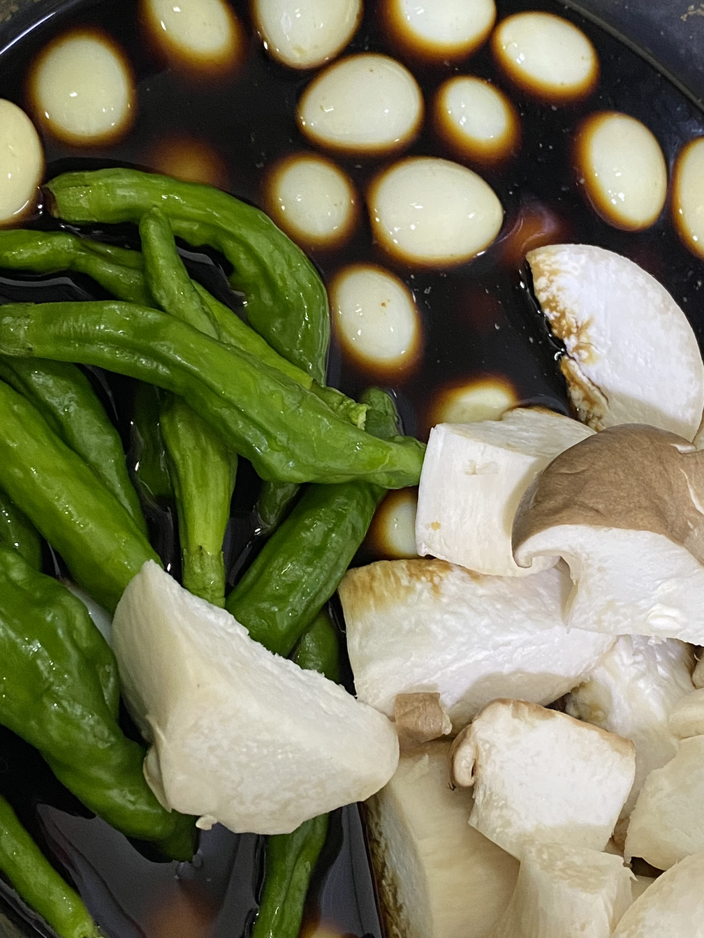 3. 간장을 끓이며 메추리알을 넣고 10분간 졸이고, 새송이 버섯과 꽈리고추를 넣고 5분간 더 졸인다.