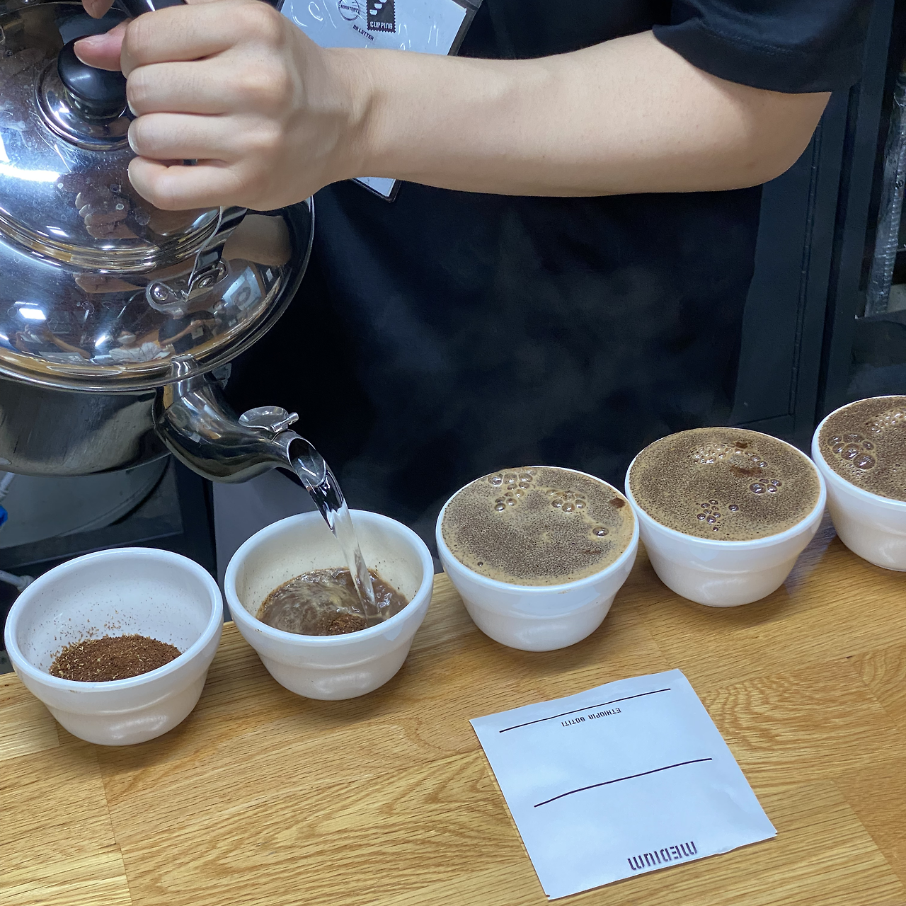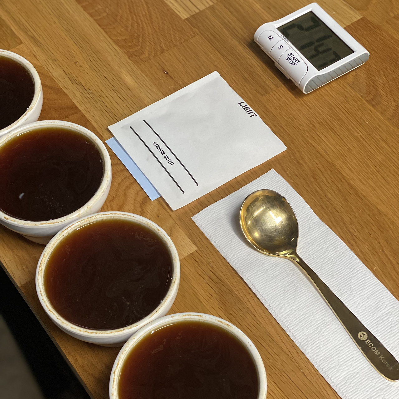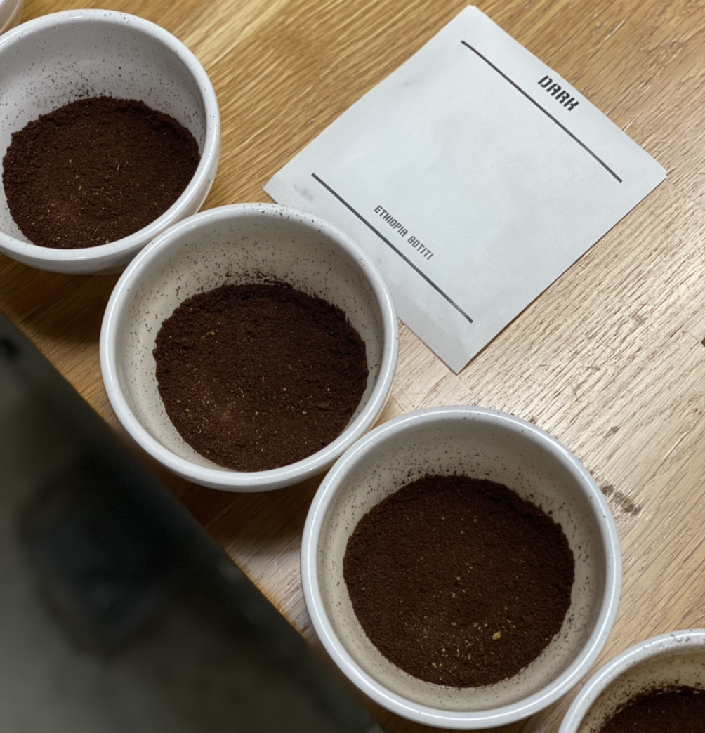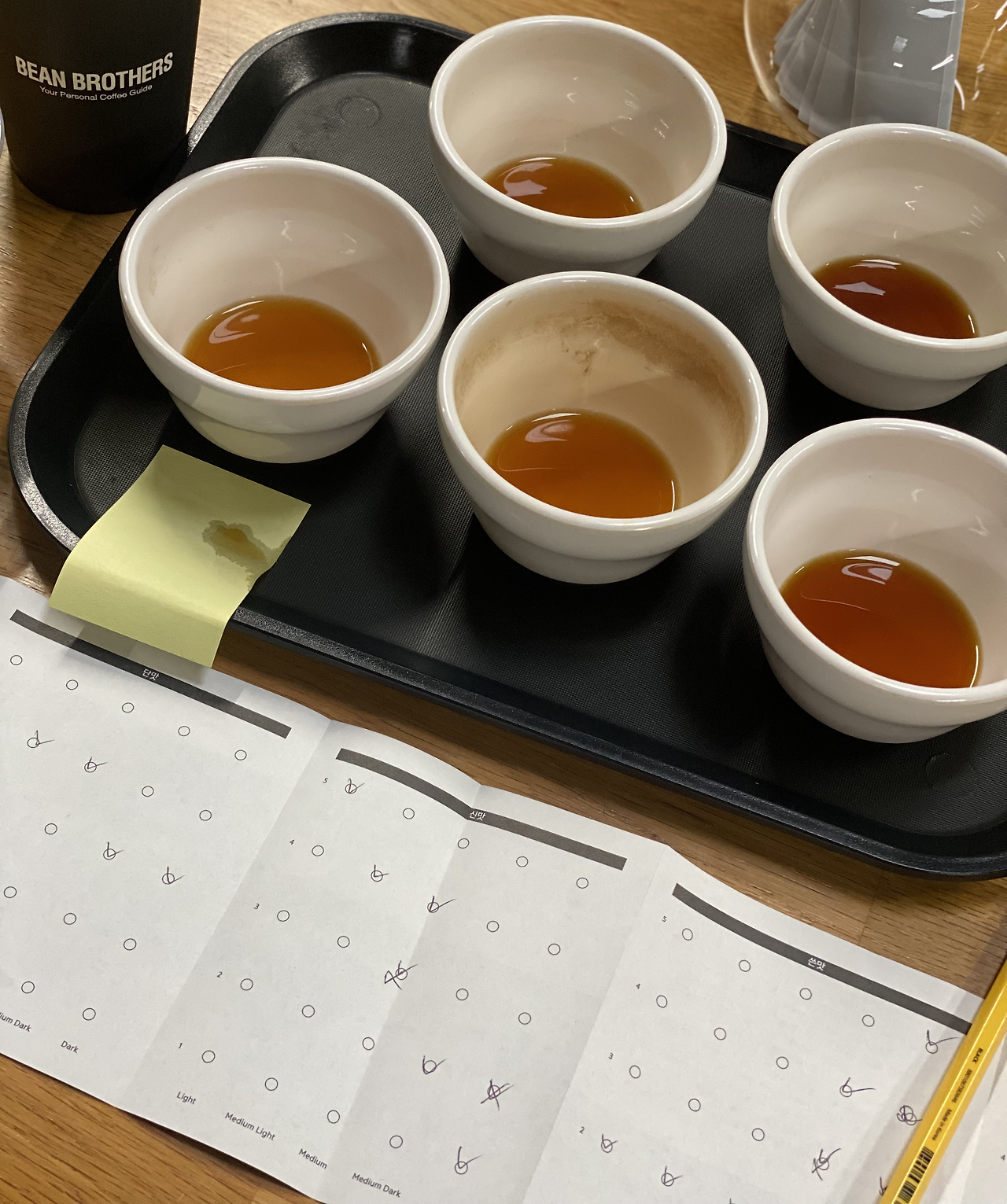 이 날의 커핑은 매우 흥미롭게도 '배전도에 따른 맛, 향 차이'를 알아보는 것이었다. 똑같은 에티오피아 원두를 로스팅 정도(원두를 익힌 정도), 즉 배전도에 따라 나누어 맛보는 것이다. 로스팅 정도는 가볍게 익힌 것에서 오래 익힌 것으로 순서는 Light - Medium Light - Medium - Medium Dark - Dark 였다.
