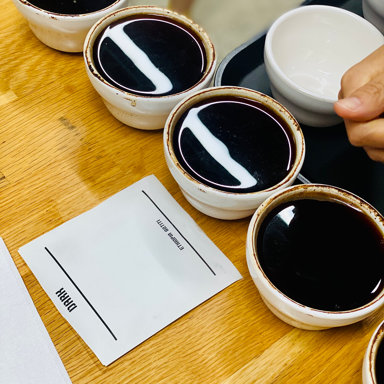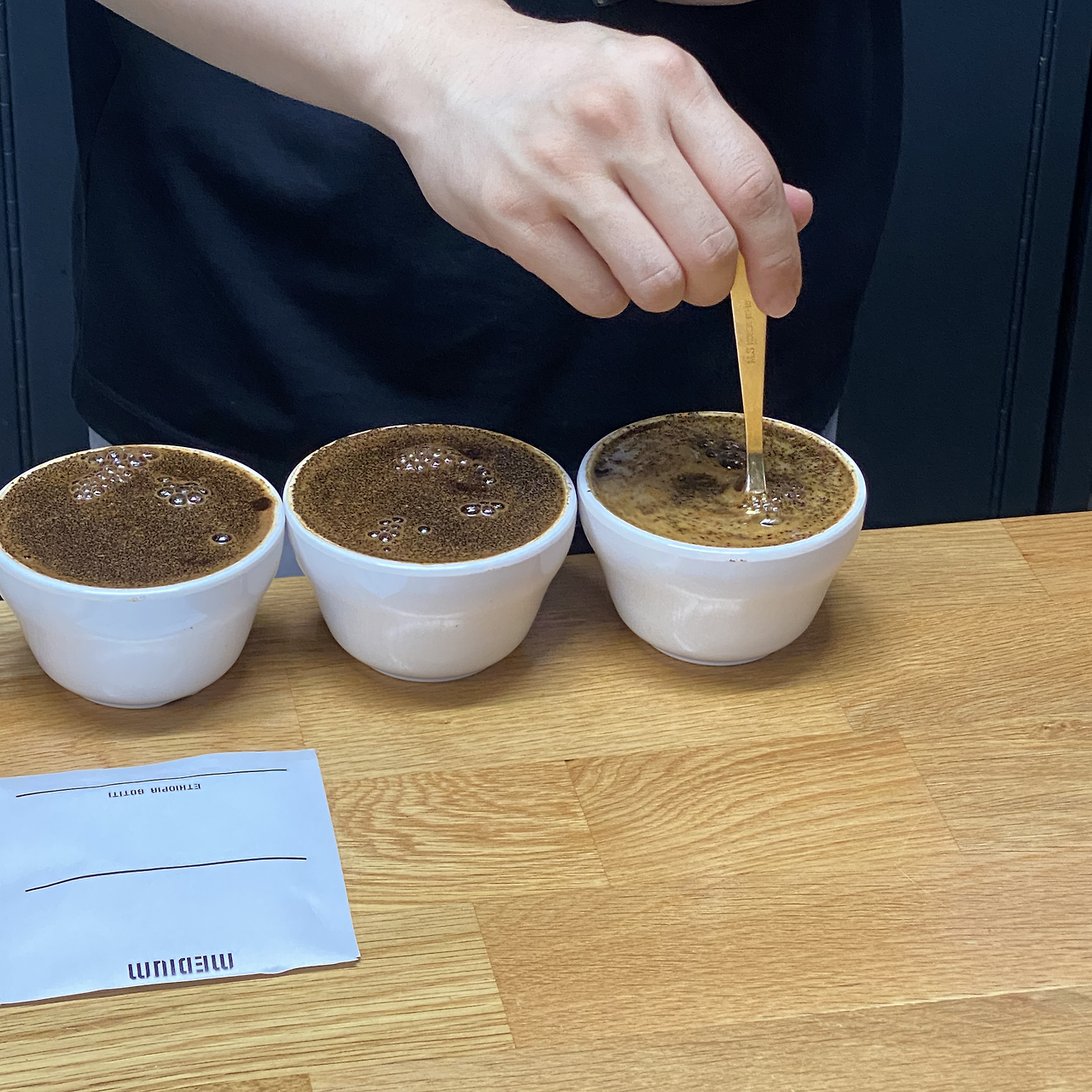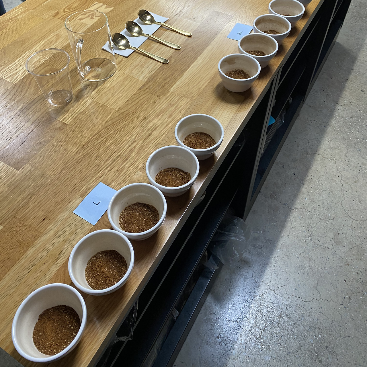 이 날의 커핑은 매우 흥미롭게도 '배전도에 따른 맛, 향 차이'를 알아보는 것이었다. 똑같은 에티오피아 원두를 로스팅 정도(원두를 익힌 정도), 즉 배전도에 따라 나누어 맛보는 것이다. 로스팅 정도는 가볍게 익힌 것에서 오래 익힌 것으로 순서는 Light - Medium Light - Medium - Medium Dark - Dark 였다.