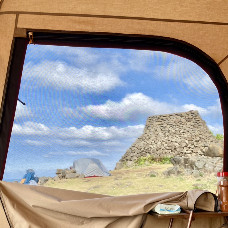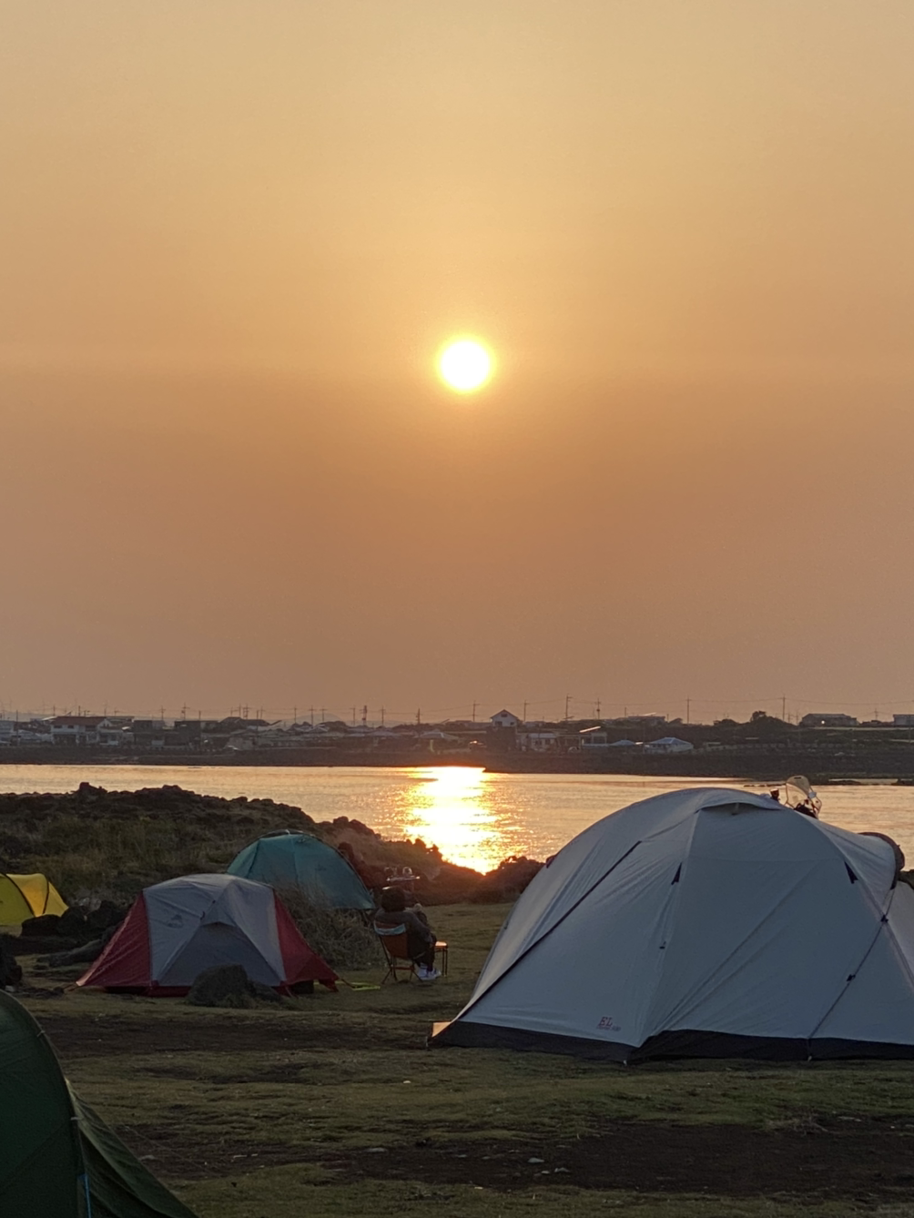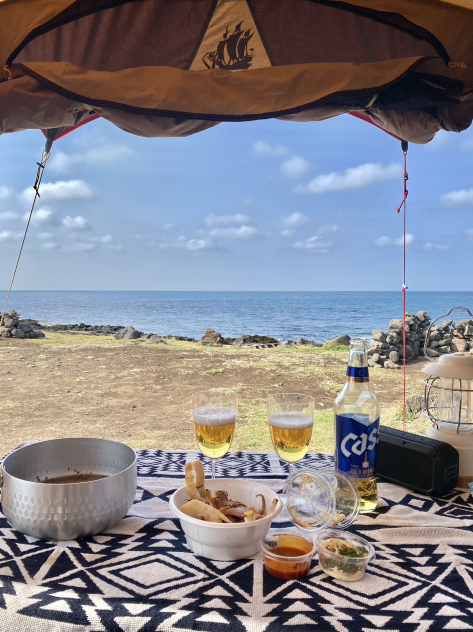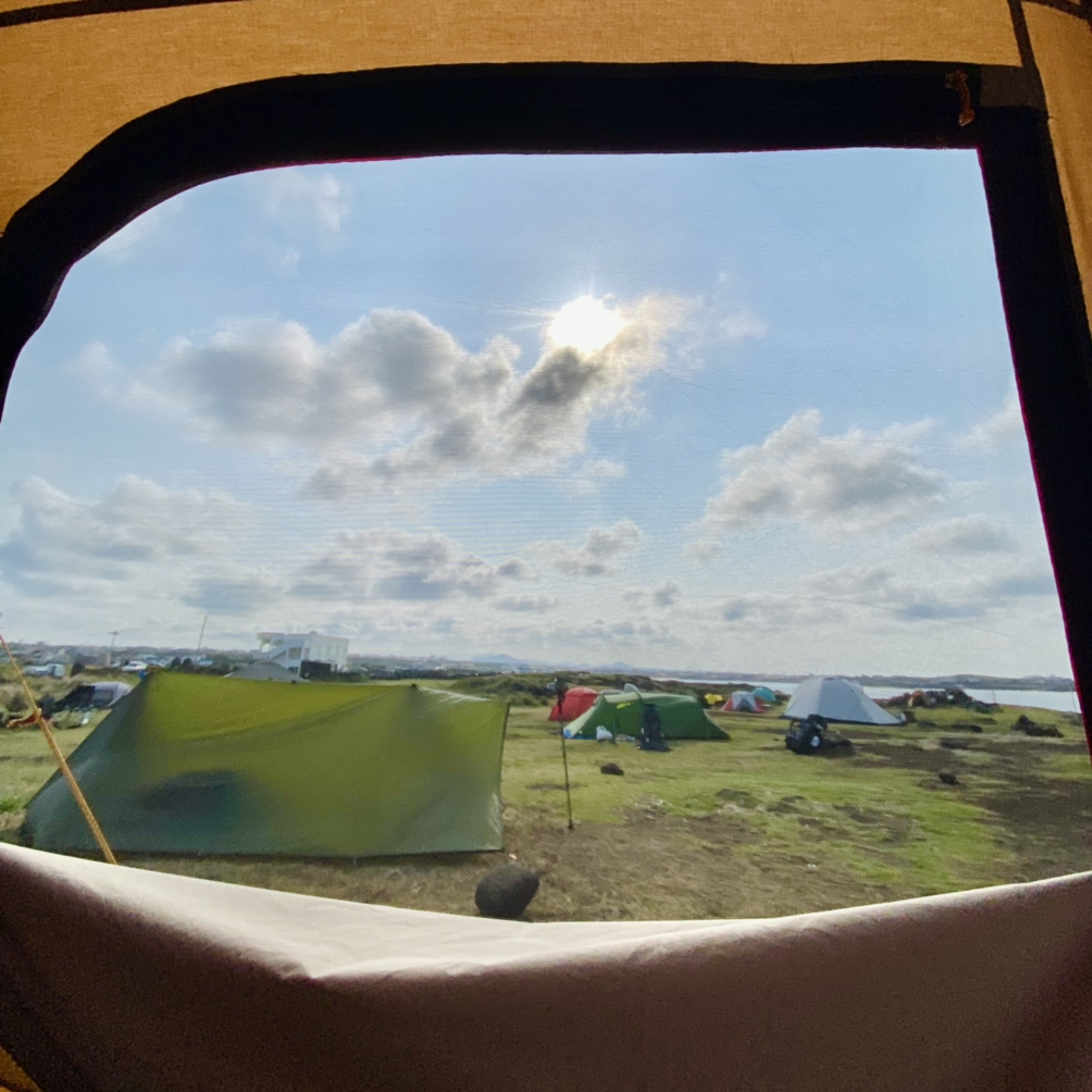 업체를 이용하여 커다란 텐트를 빌릴 수 있었다. 우도 한달살이를 하며 비양도 캠핑을 총 두 번 하였는데 이 날 역시 날씨가 참 좋았다. 텐트의 양 옆을 창문처럼 내리면 보이는 풍경이 꼭 르누아르의 그림처럼 아름다웠다.