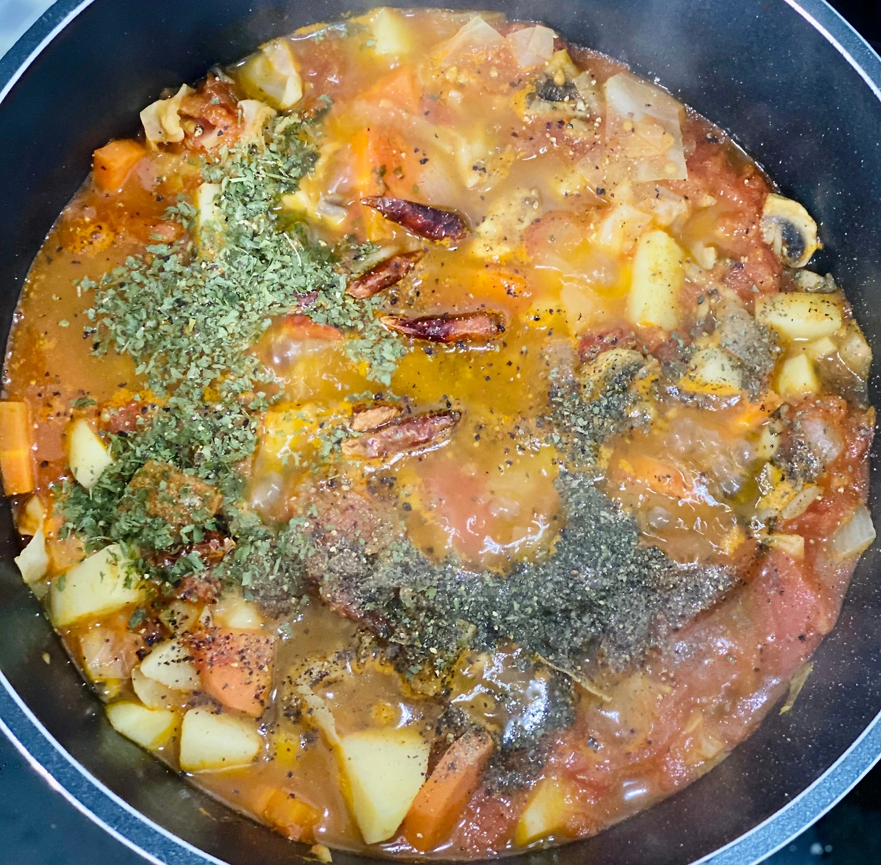 7. 달달한 매콤함을 위해 페퍼론치노를, 향긋함을 위해 각종 허브가루를 넣어주면 끄읕!