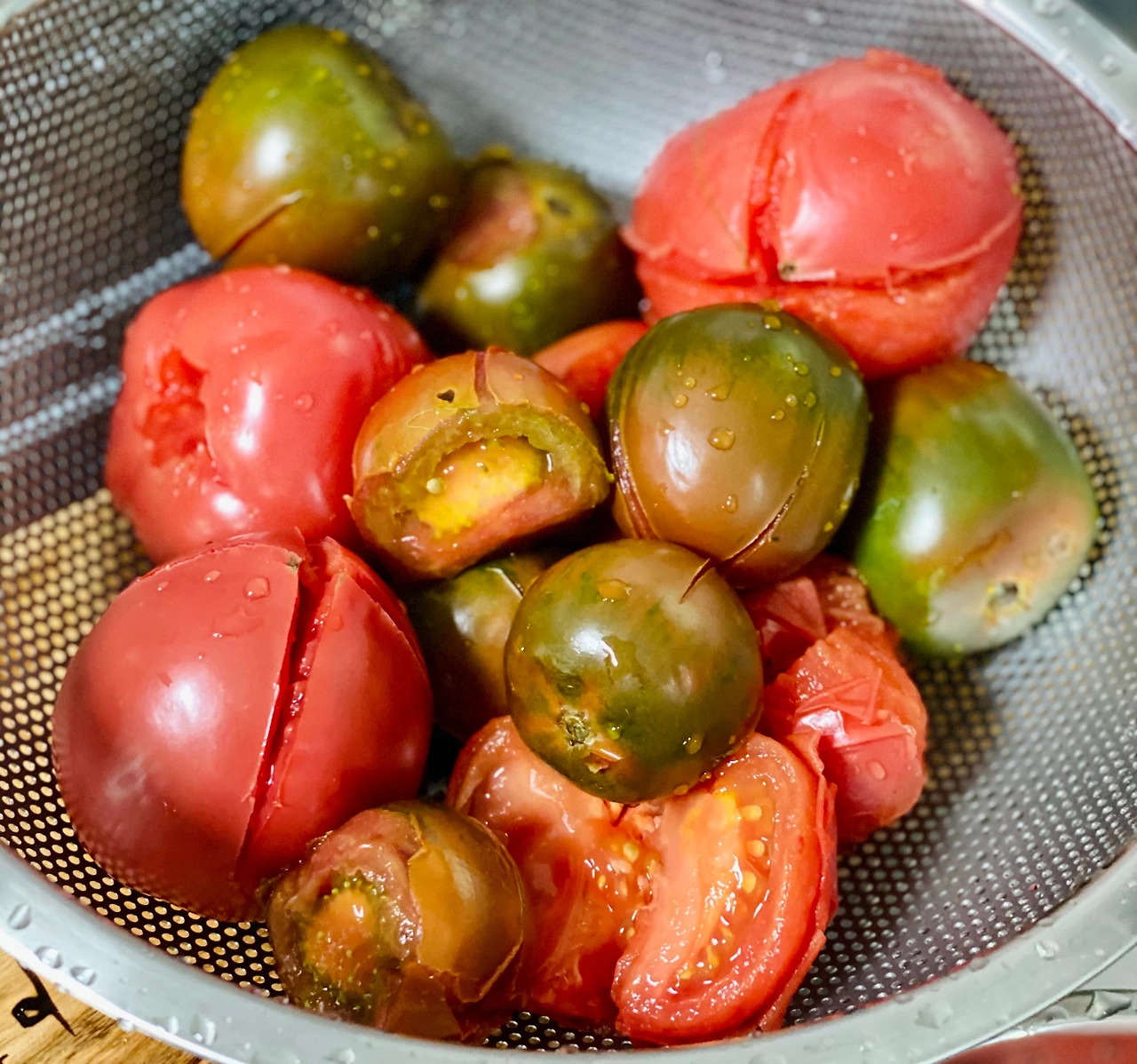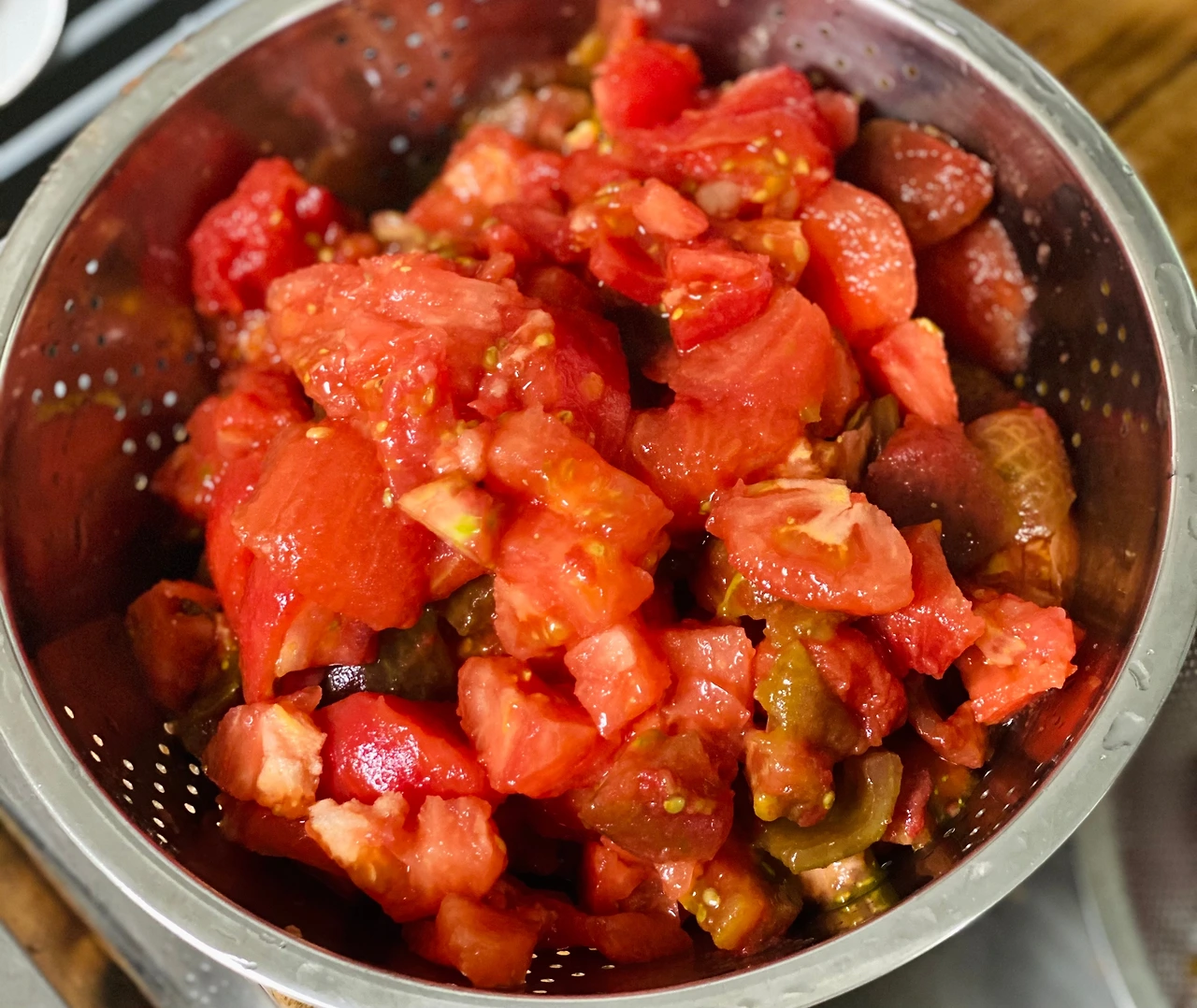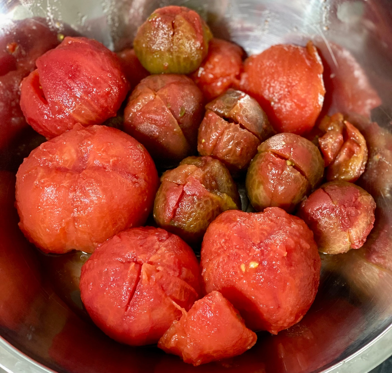 2. 데쳐서 껍질을 벗긴 토마토를 마구 으깨준다.