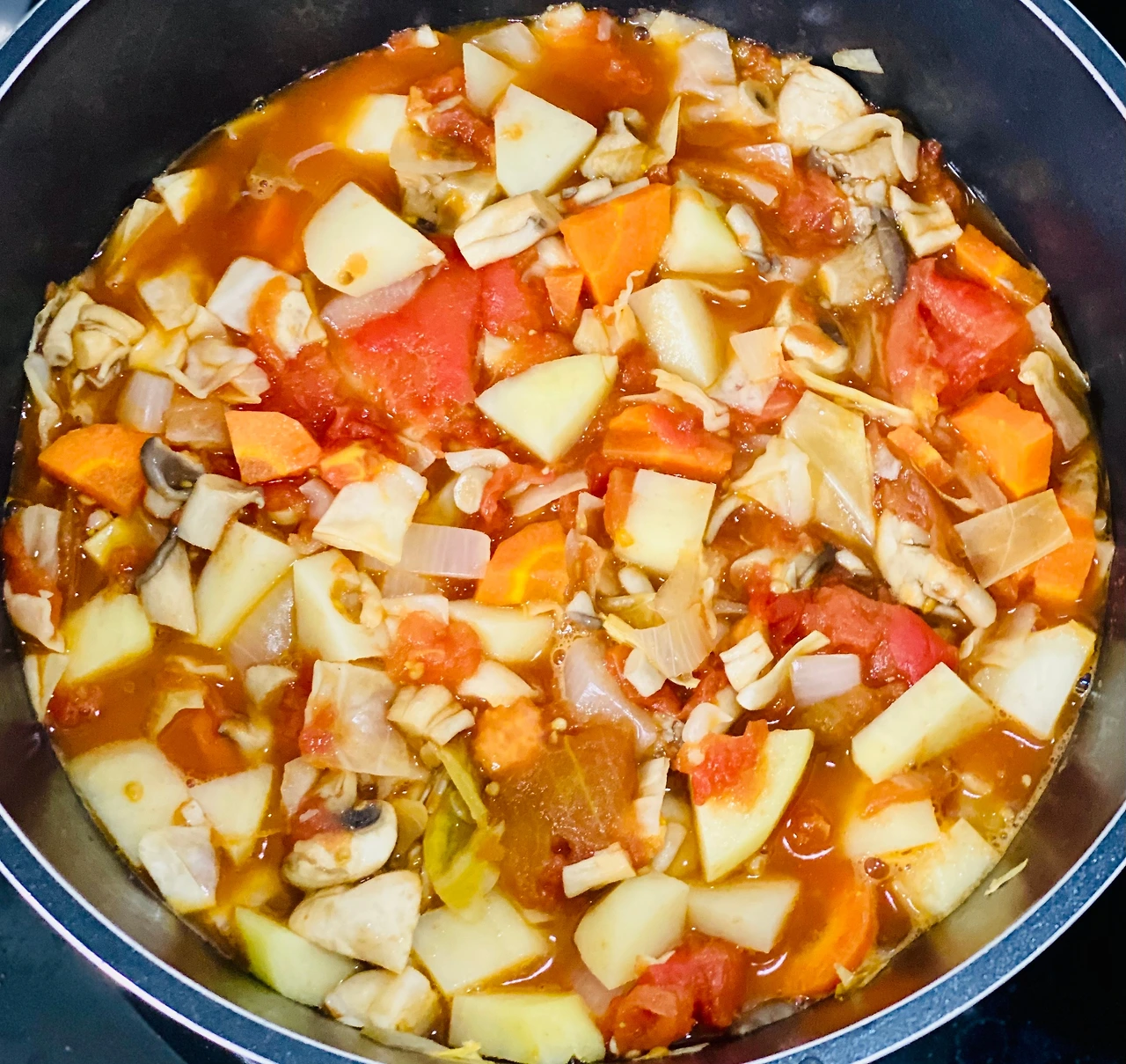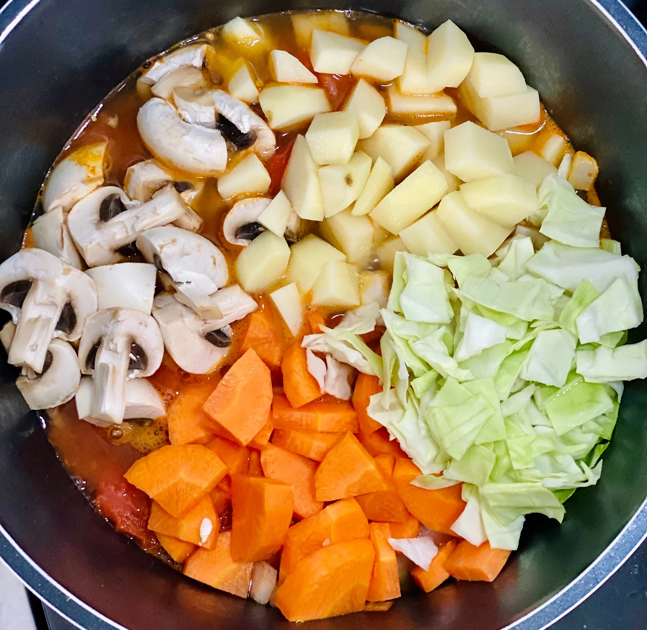 5. 먹기 좋은 크기로 챱챱 썬 양배추, 감자, 양송이버섯, 당근을 넣어준다. (냉장고 야채들 정모!)