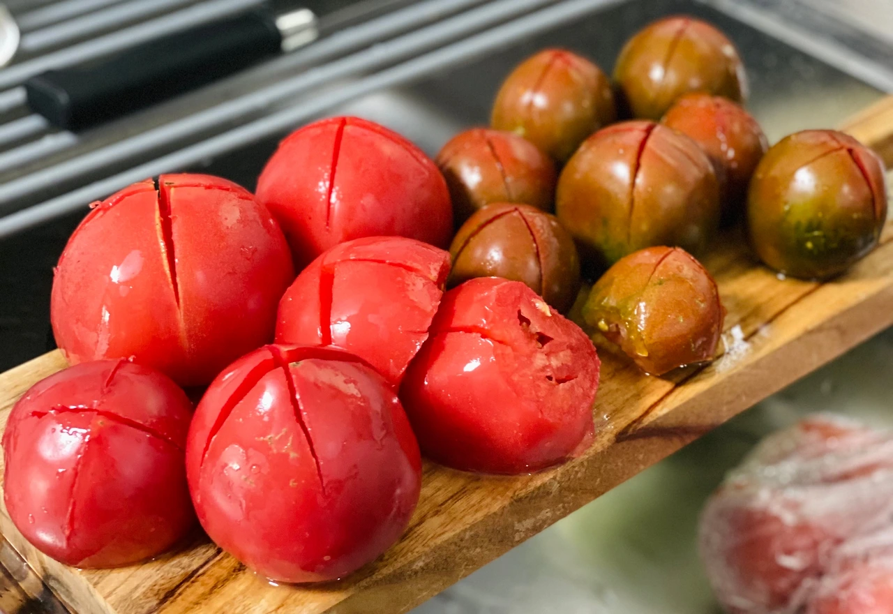 1. 빨갛게 잘 익은 완숙 토마토의 엉덩이에 십자로 칼집을 내어준다. 이렇게 하면 데쳤을 때 십자로 자른 부분을 잡고 손쉽게 껍질을 제거할 수 있다.