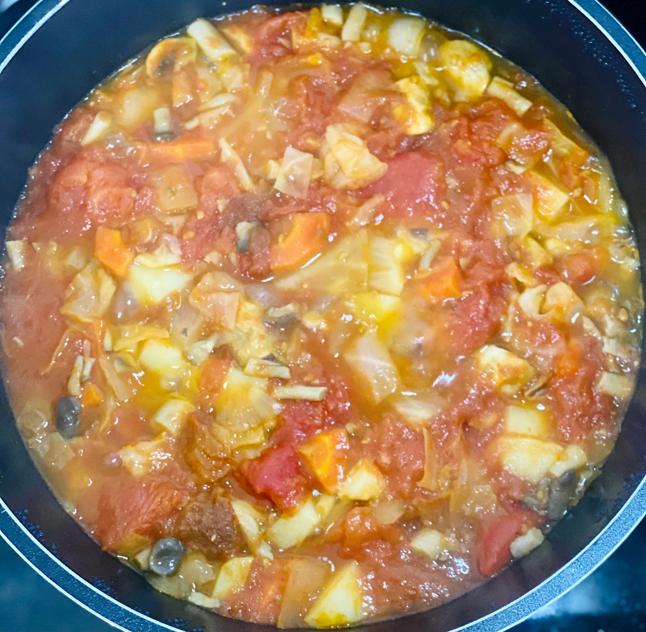 6. 물은 한 방울도 넣지 않고, 약불에 오래 끓여준다. 야채에서 채수가 나오기 때문에 끓이다 보면 금방 국물이 차오른다.