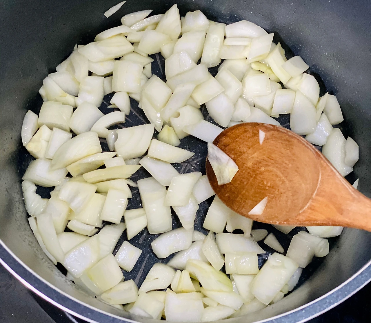 3. 중불로 달군 커다란 냄비에 챱챱 썬 양파를 올리브유에 볶아준다.