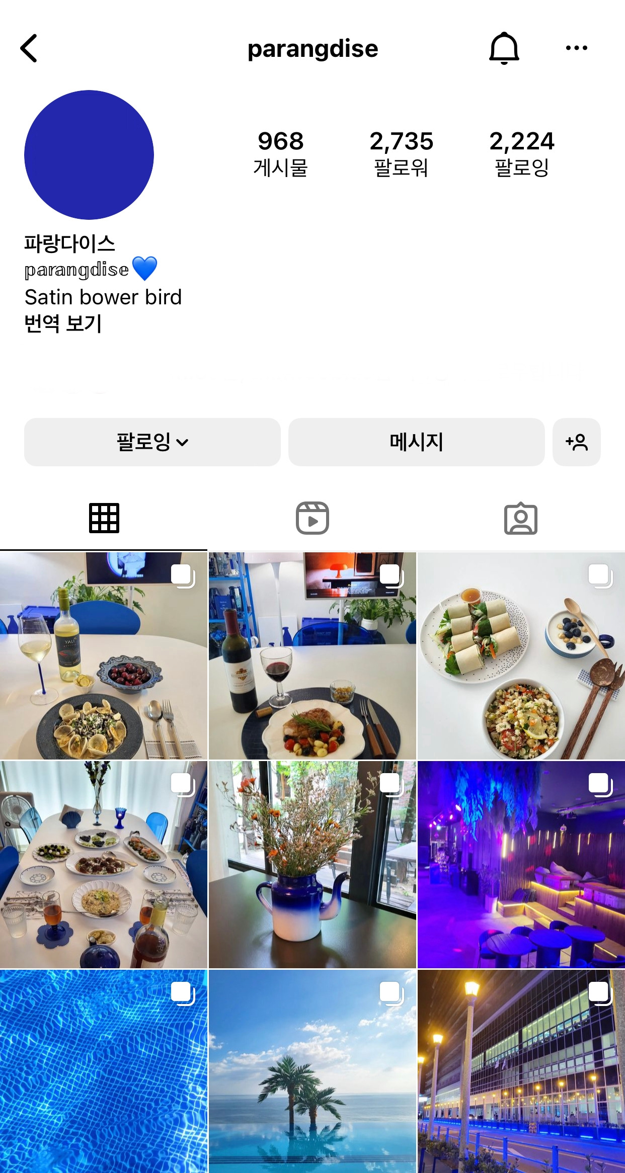 어언 10년 전, 페이스북의 시대가 저물고 인스타그램이라는 새로운 태양이 떠올랐을 때, 계정을 전체 공개로 만들고 파란색 물건, 공간 사진 등을 올리는 아카이빙을 했었다. 그러면서 나처럼 파란색을 좋아하는 사람들이 '좋아요'를 눌러주었었는데, 그렇게 서로 올리는 사진에 대해 '좋아요'를 보내는 시간이 쌓이다 보니 마치 현실에서 만난 친구보다 더 가까운 느낌이 들기도 했다.
