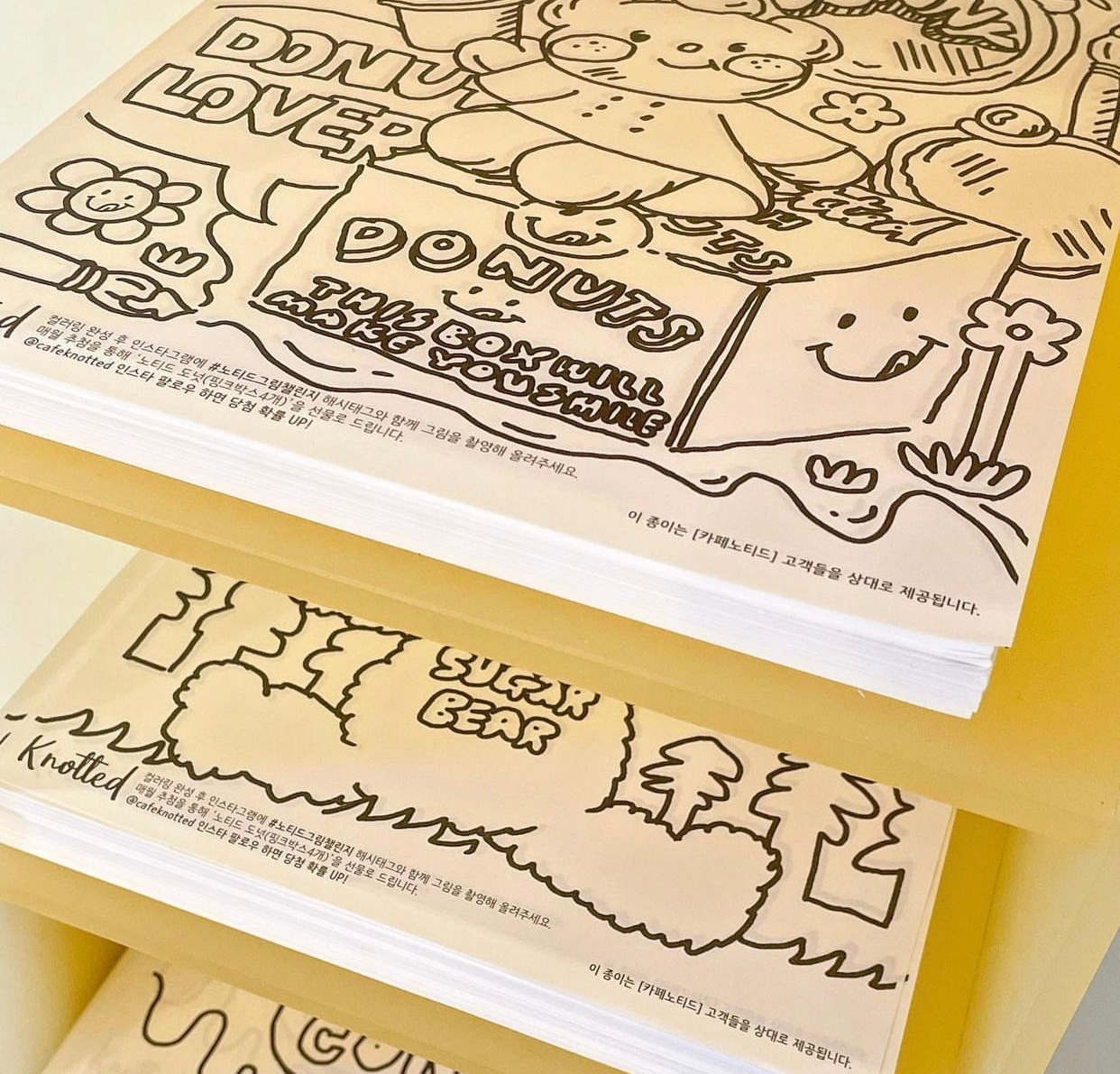 노티드의 강점은 '귀여움'에 있다. 분홍색, 노란색 등의 알록달록한 인테리어가 딱 '인스타그래머블'하다. 어디에서 사진을 찍어도 인스타그램에 올리기 좋은 사진이 나온다. 또한, 무료로 가져갈 수 있는 스마일 스티커가 있다. 초록색, 노란색, 분홍색의 스마일 스티커를 원하는 만큼 가위로 잘라갈 수 있고, 아이들을 위한 컬러링 페이퍼도 넉넉히 놓아져 있다.