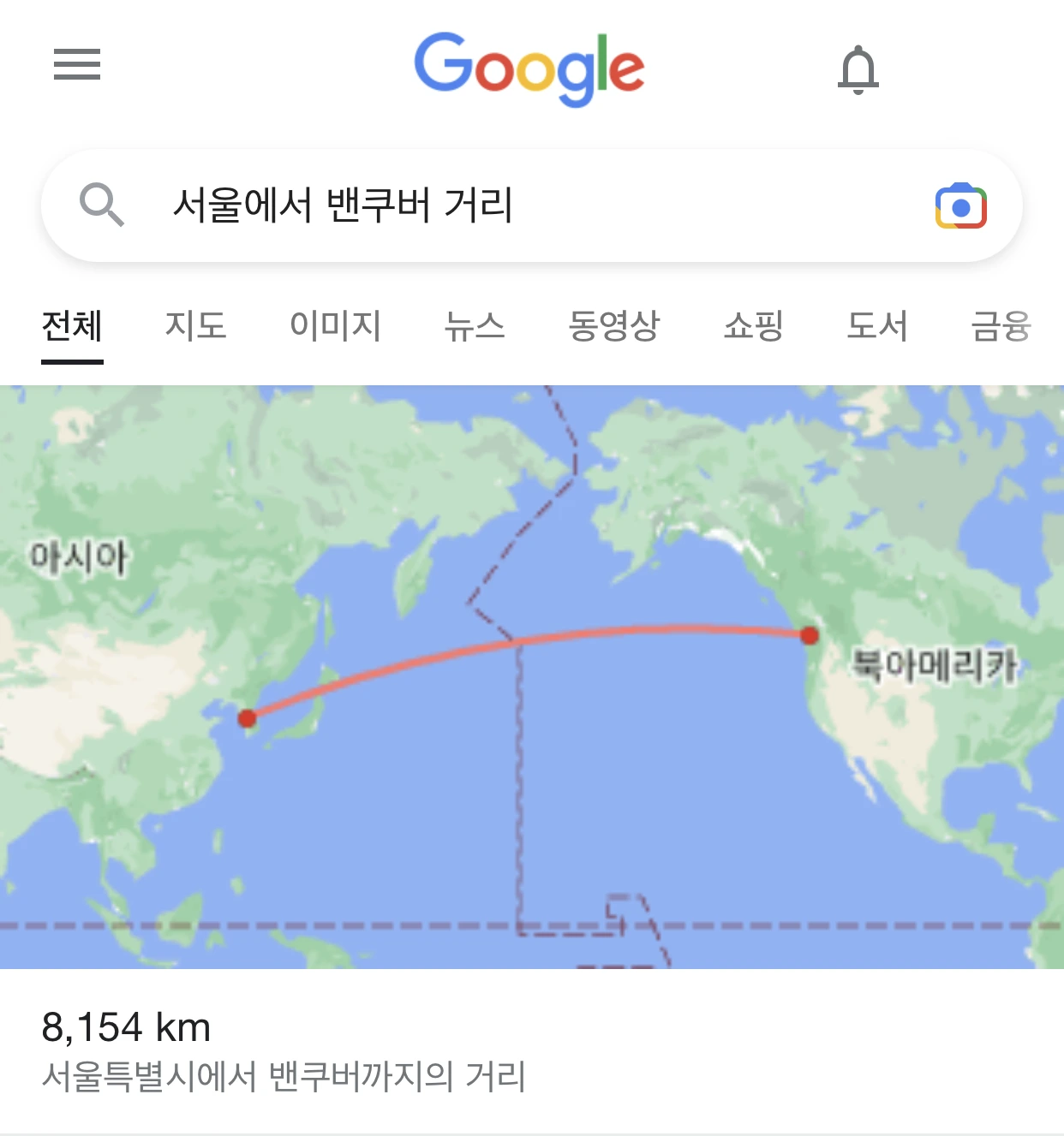 서울에서 밴쿠버까지 8,154km더라고요. 정말 먼 거리지만, 랜선으로 얼굴 보며 수다 떨 수 있음에 감사함을 느낍니다. 땡스 투 구글•••!