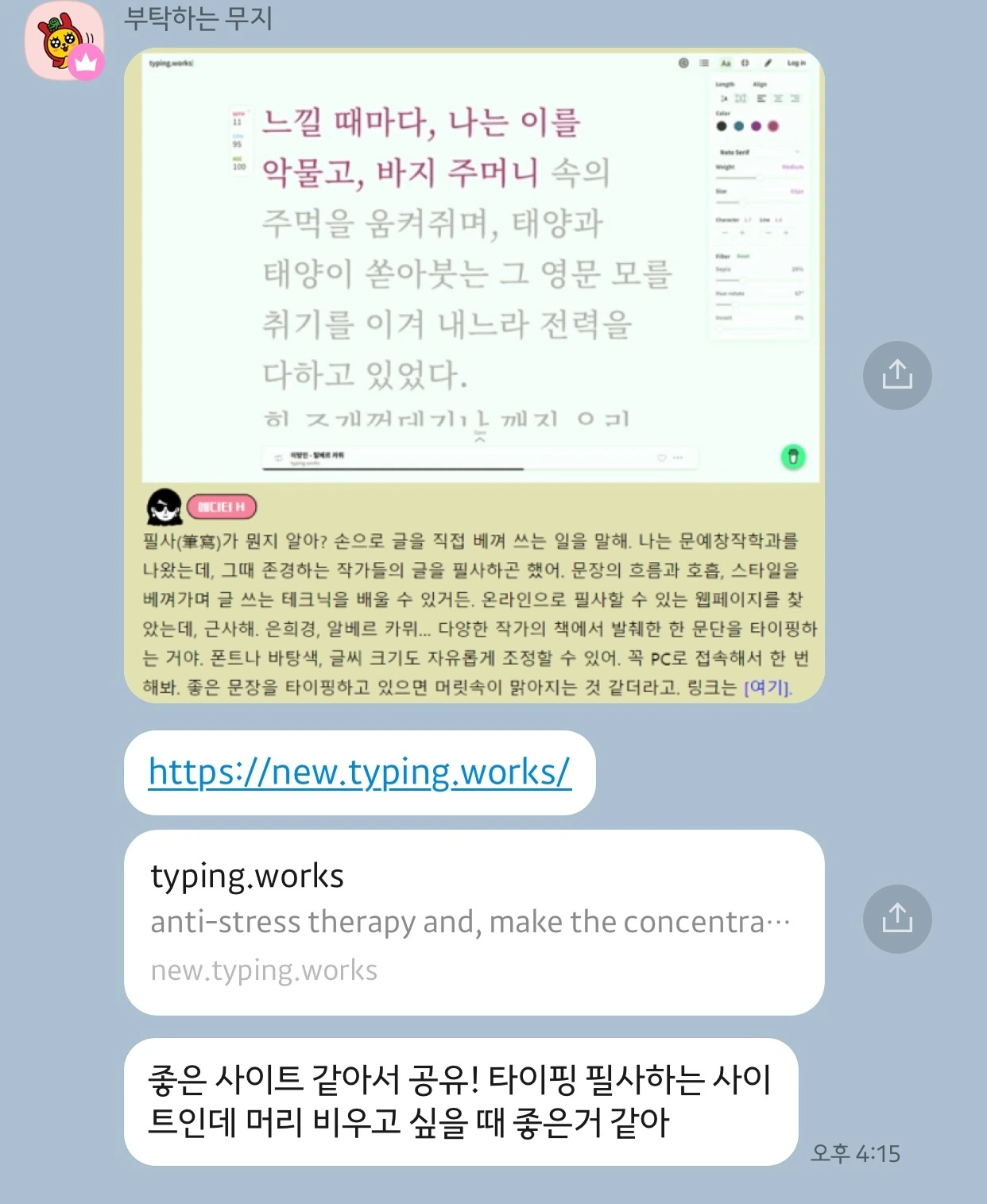 무라카미 하루키, 정혜윤, 황정은 등 닮고 싶고 쫓고 싶은 소설가 선생님들의 명문장으로 만든 타이핑 프로그램이라니! '유레카!'를 외치며 열심히 타이핑을 해보았다. 그중에서 마냥 지나칠 수 없는 문장들을 따로 브런치에 기록해본다.