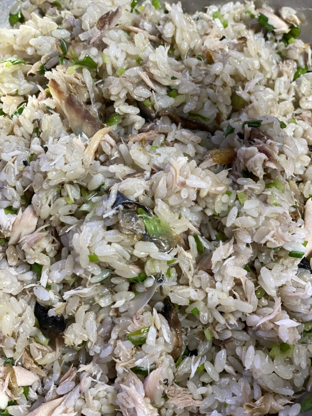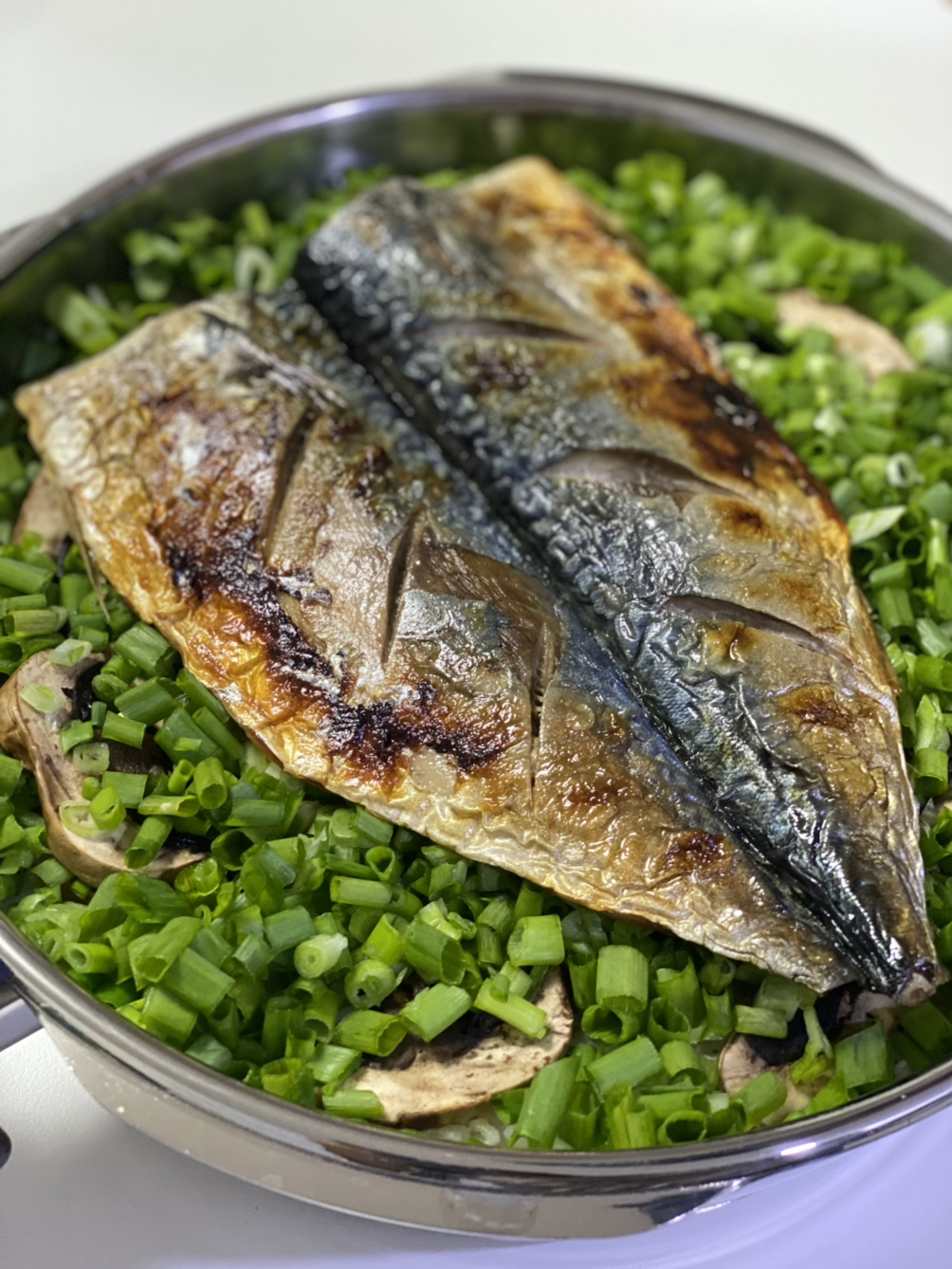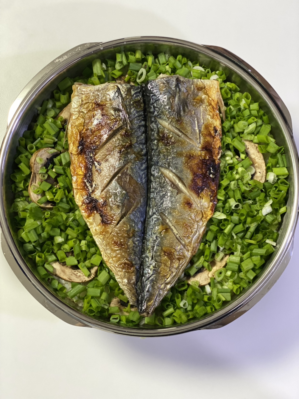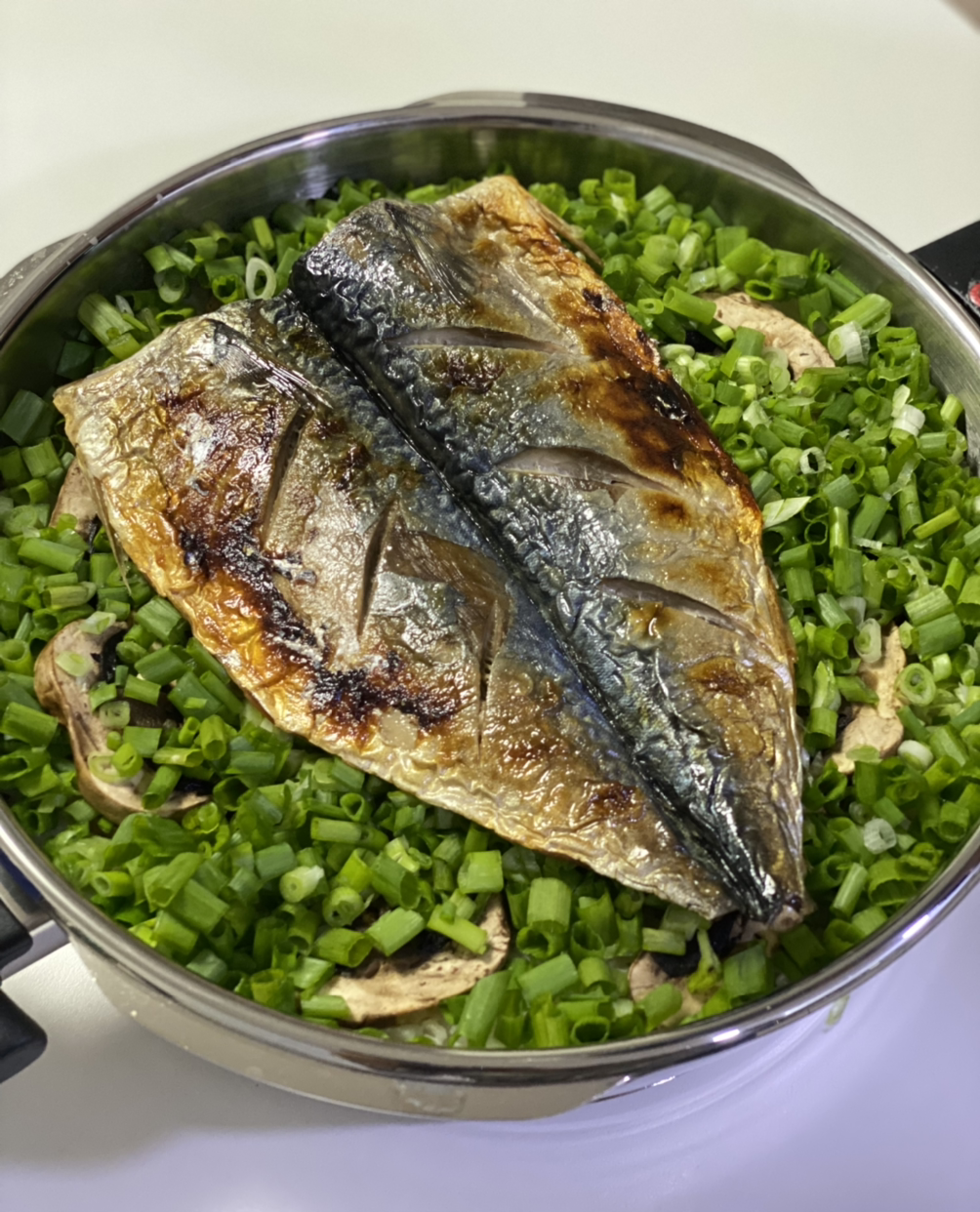 8. 완성된 솥밥에 쪽파를 올리고, 고등어를 올려 사진을 찍는다!