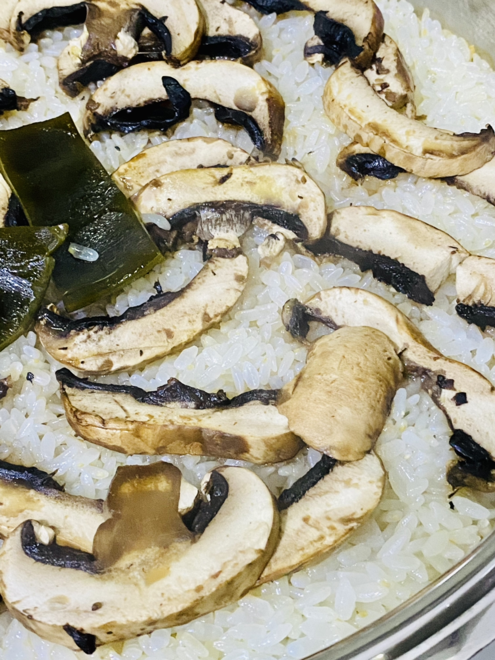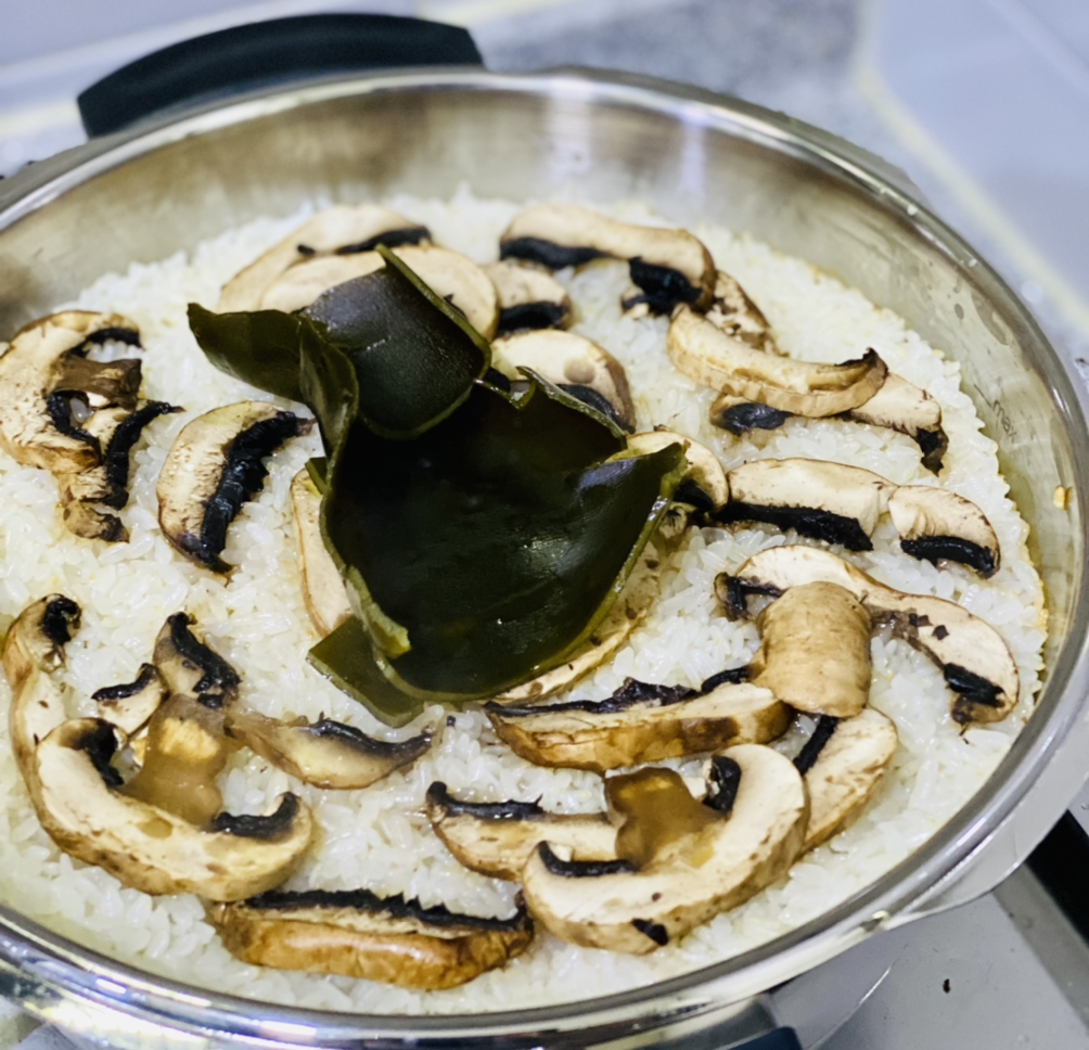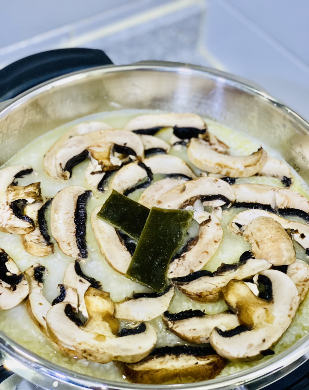6. 양송이를 예쁘게 둘러준 후, 다시마를 중앙에 놓고 밥을 안친다.