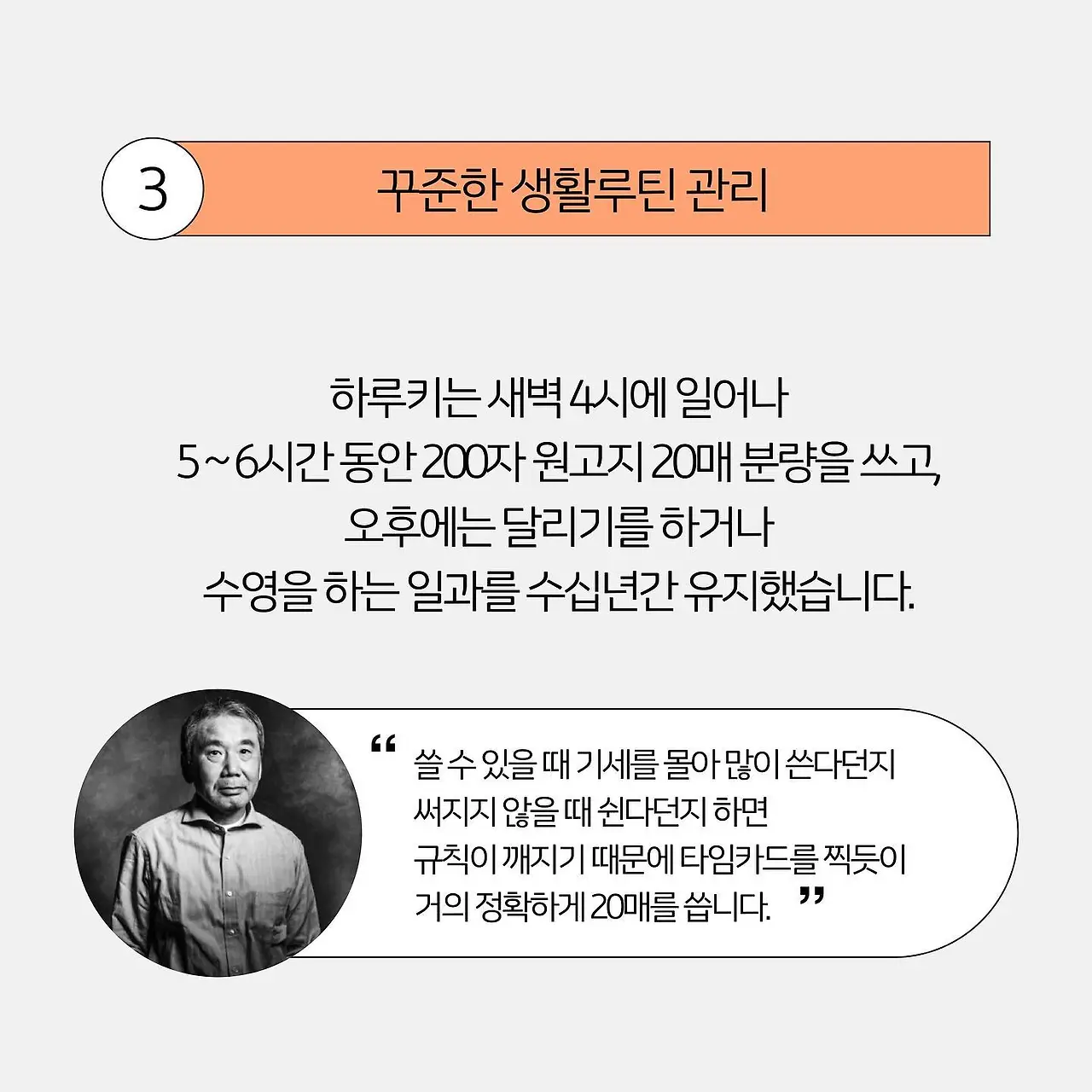 매일 한 개의 글을 써서 매일 브런치에 업로드하는 '100일 챌린지'(이제 3일밖에 안 남았다, 맙소사!)를 하며 자주 말하곤 했던 ‘무라카미 하루키’의 루틴.